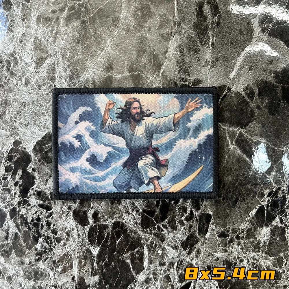 Parches de insignia de moral de olas de Jesús Kanagawa para surf, brazalete táctico, pegatina de mochila con estampado de gancho y bucle del ejército militar