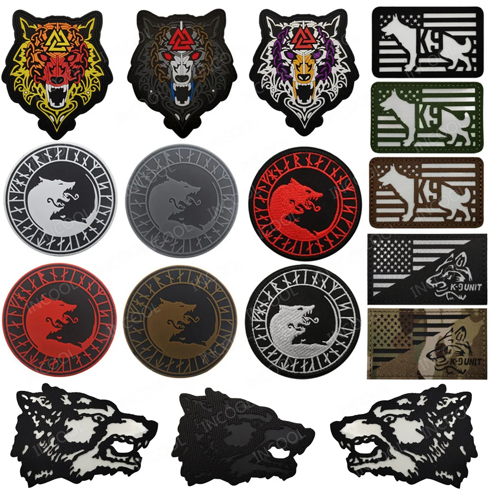 [Especificación]:Parches de perro tigre de goma de PVC luminosos de lobo negro ultratados reflectante infrarrojo, emblema aplicado bordado