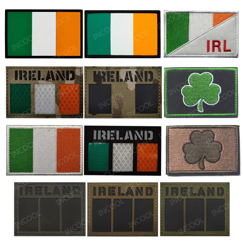 [Especificación]:Parches reflectantes de la bandera de Irlanda por infrarrojos, banderas bordadas irlandesas de goma de PVC 3D, apliques para brazalete, parche de trébol para sombrero y bolsa
