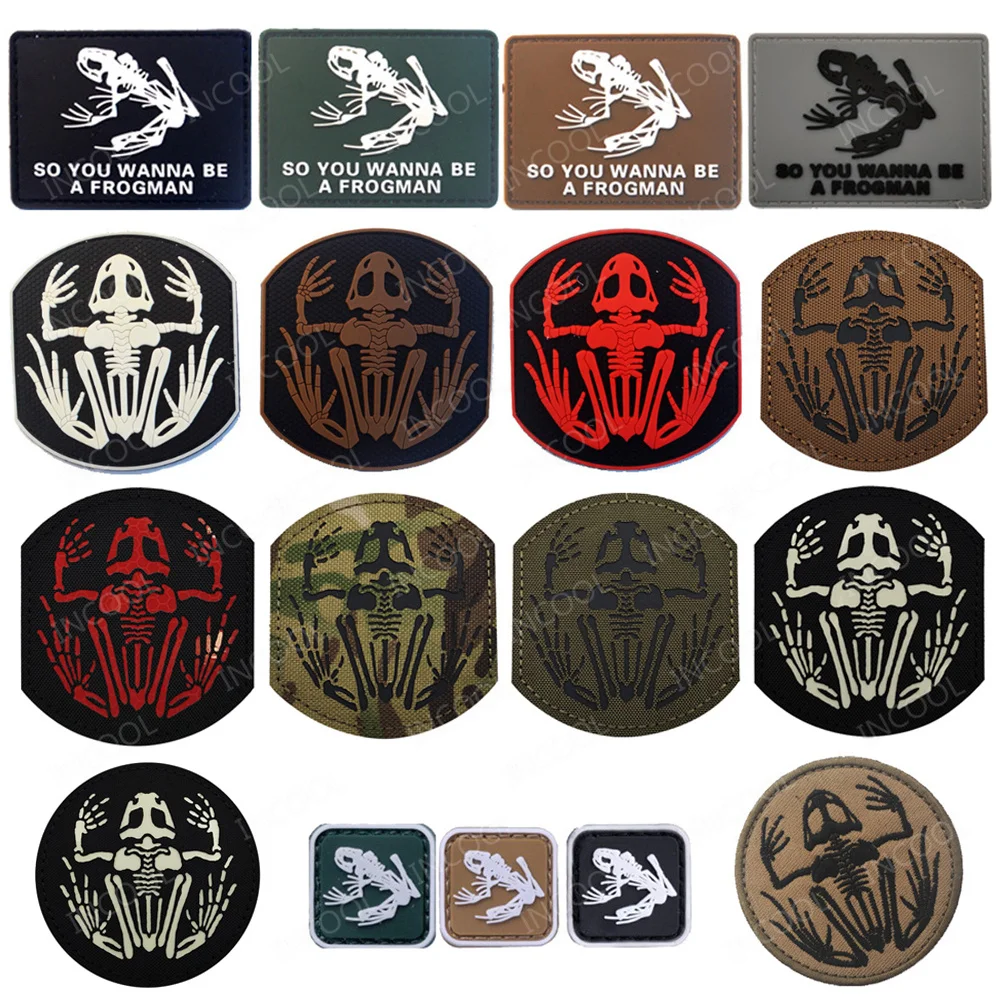 [Especificación]:Parches reflectantes IR de rana con esqueleto de hueso de calavera, te querer ser un rana, hombro con apliques de goma de PVC brillante
