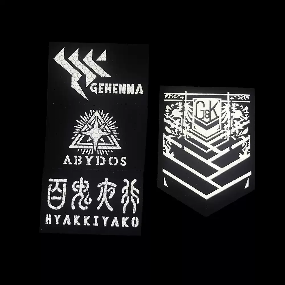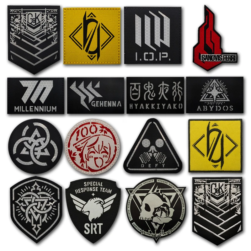 Parches tácticos de archivo azul, brazalete reflectante IR de Anime, mochila Millennium Henna Trinity, insignias de primera línea con gancho para niñas