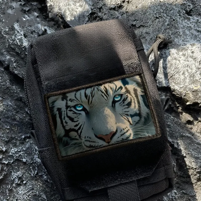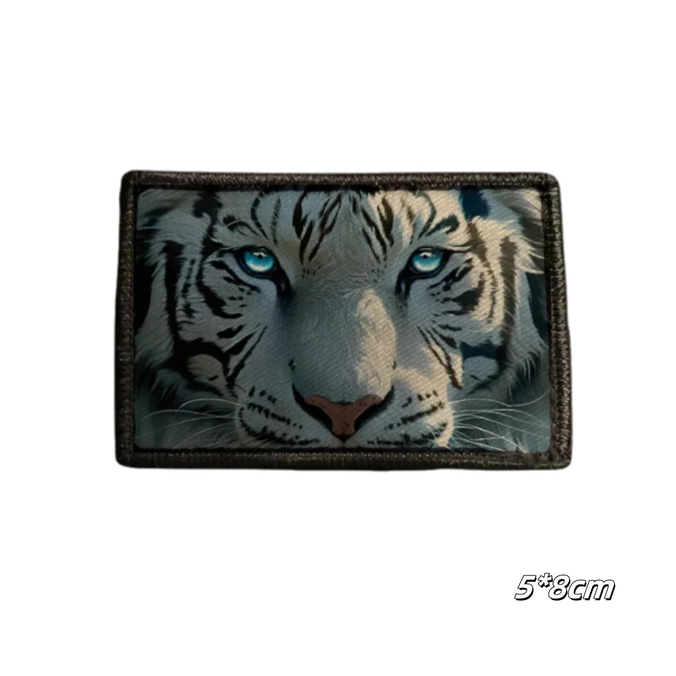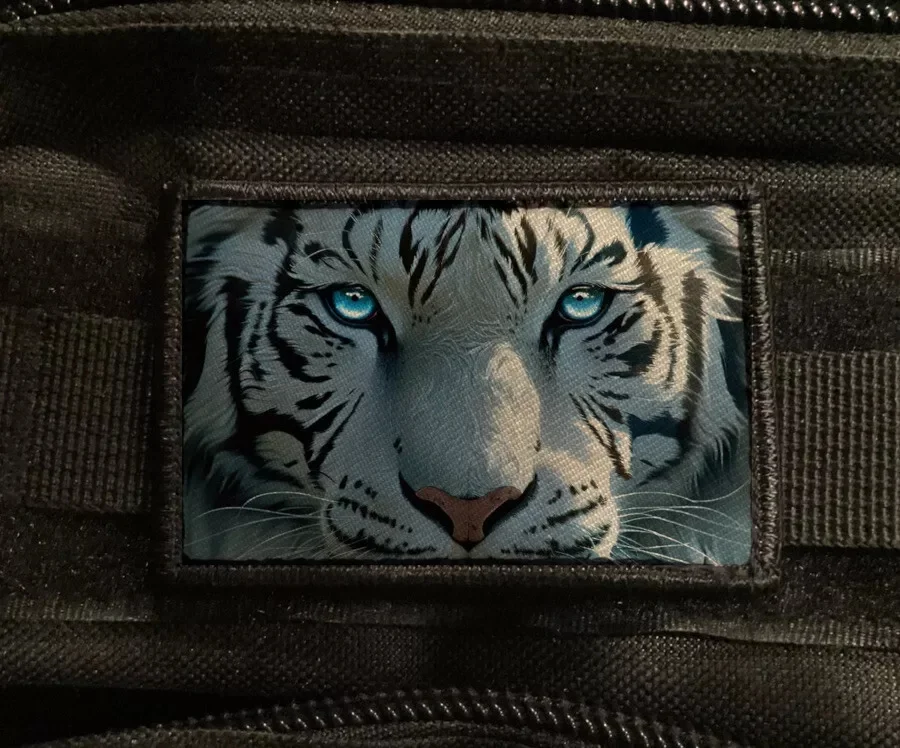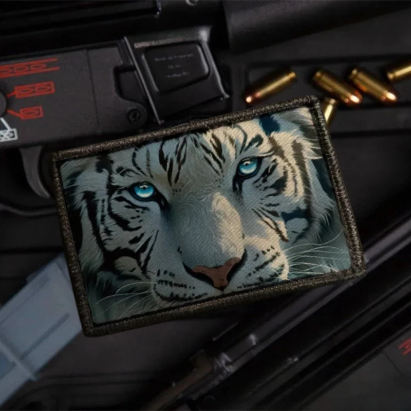 Parches tácticos de tigre de ojos azules, emblema de gancho y bucle impreso divertido, insignia de moral de tigre del ejército militar, pegatinas para mochila con brazalete