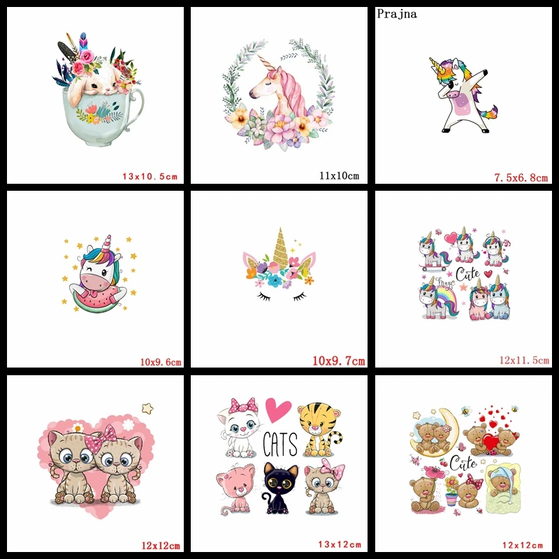 10 piezas al por mayor, aplicación de unicornio gato, parches de transferencia de hierro para ropa, pegatinas térmicas de transferencia de calor de animales de dibujos animados DIY