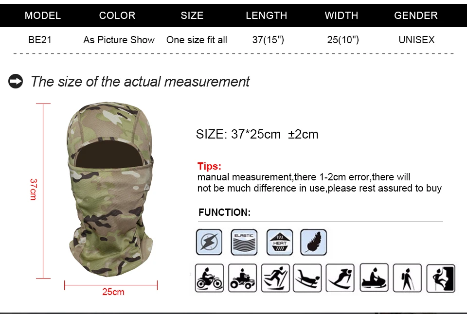 Adecuado para actividades al aire libre, esquí, patinaje, motos de nieve, snowboard, motociclismo, ciclismo, ciclismo, correr, paseos en bote, trotar, senderismo, pesca, surf, caza, montañismo, camping, senderismo, paintball, ciclismo y muchos otros usos.