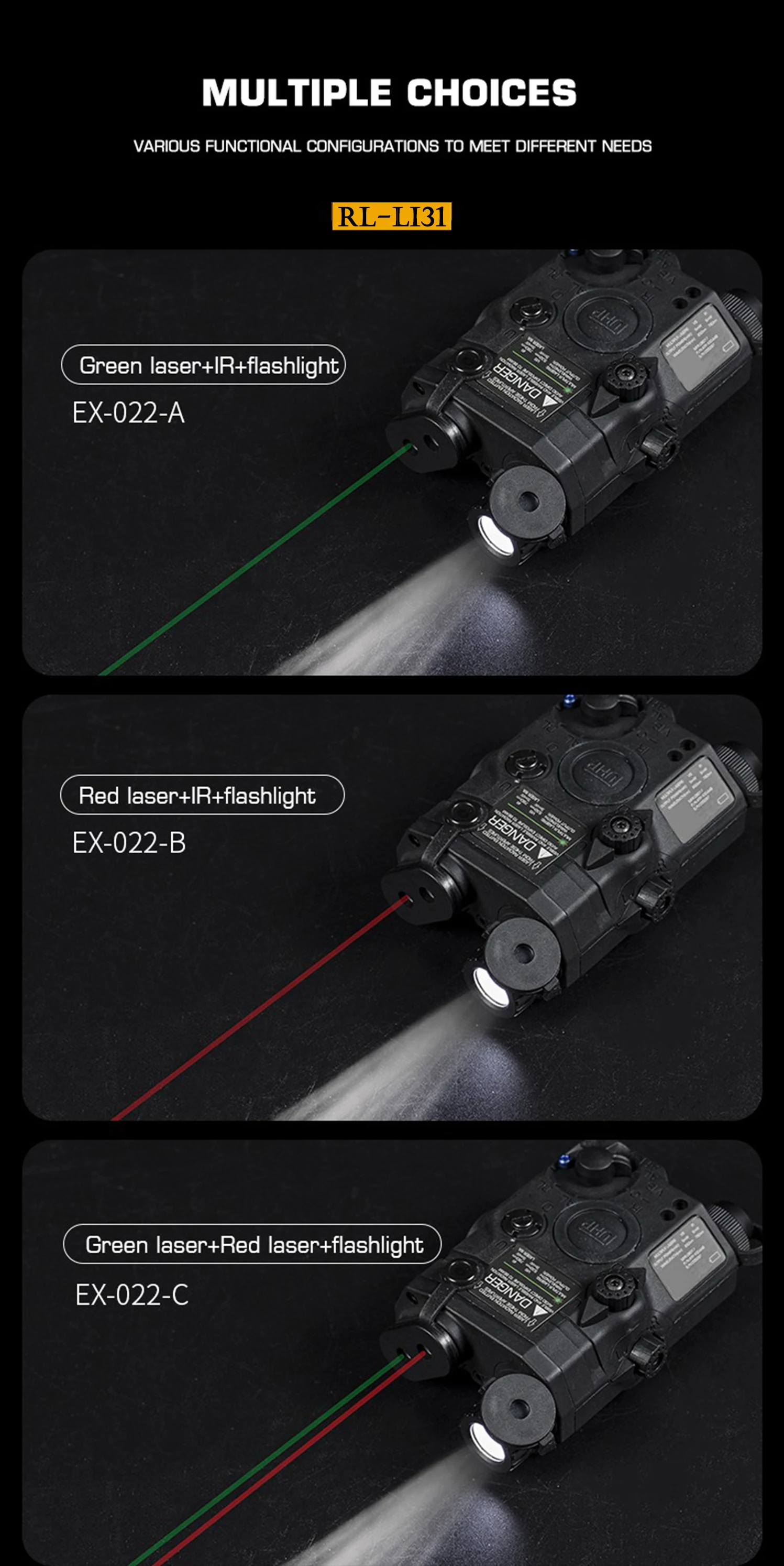 Serie C: láser verde + láser rojo + linterna de 100 lúmenes