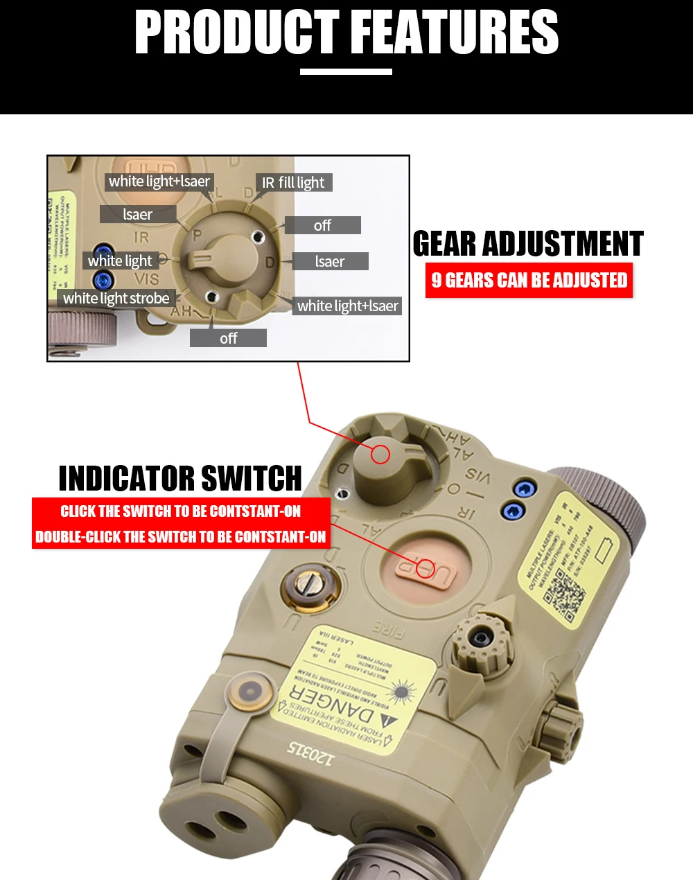 Función: Láser momentáneo, Láser constante, Luz de relleno IR momentánea, Luz de relleno IR constante, Luz blanca cálida momentánea, Luz blanca constante, Luz estroboscópica blanca, Luz láser y blanca constante, Luz láser y blanca momentánea. encendido