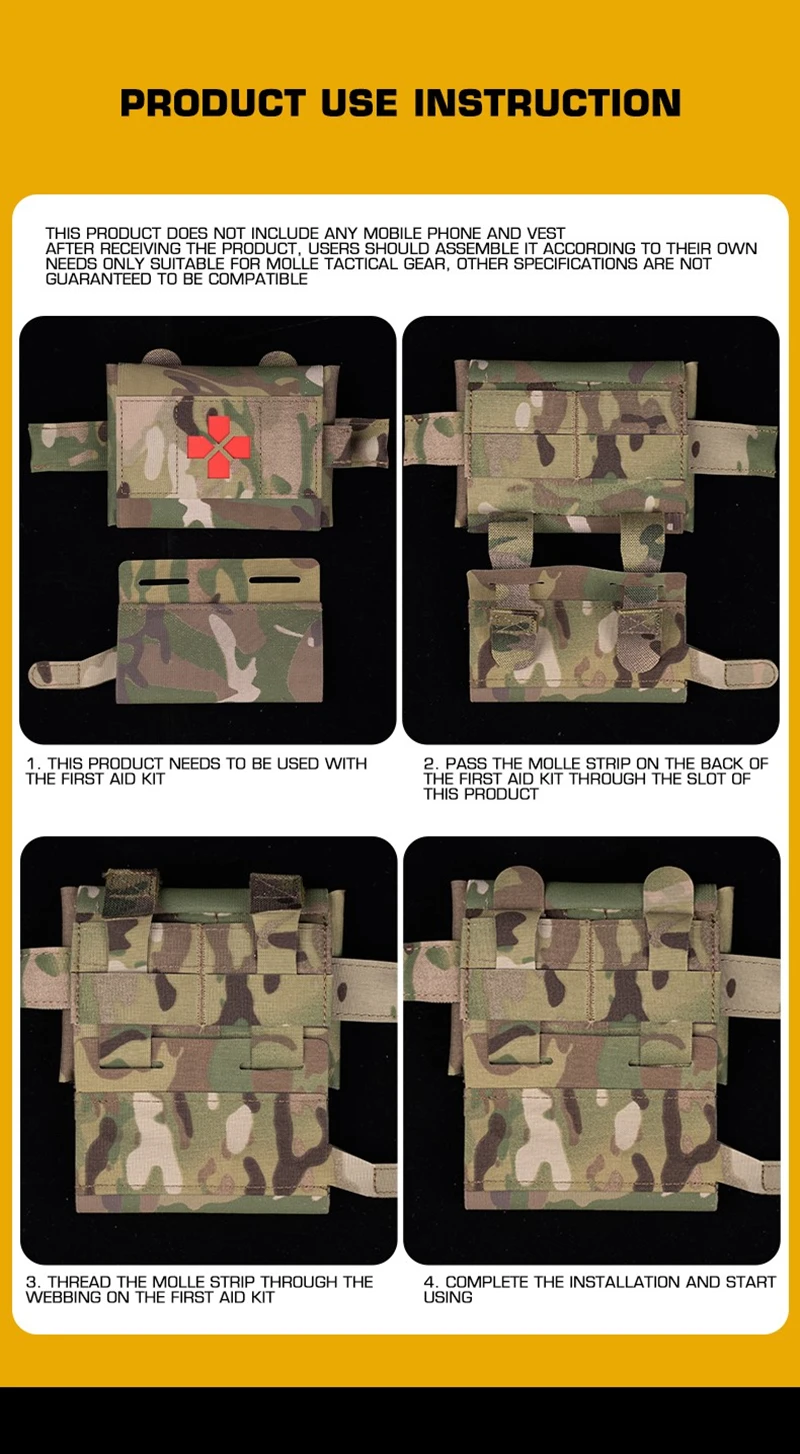 Adaptable a Molle: se puede montar en una plataforma de correas molle de 3 filas, se puede colgar hacia abajo o en la parte superior