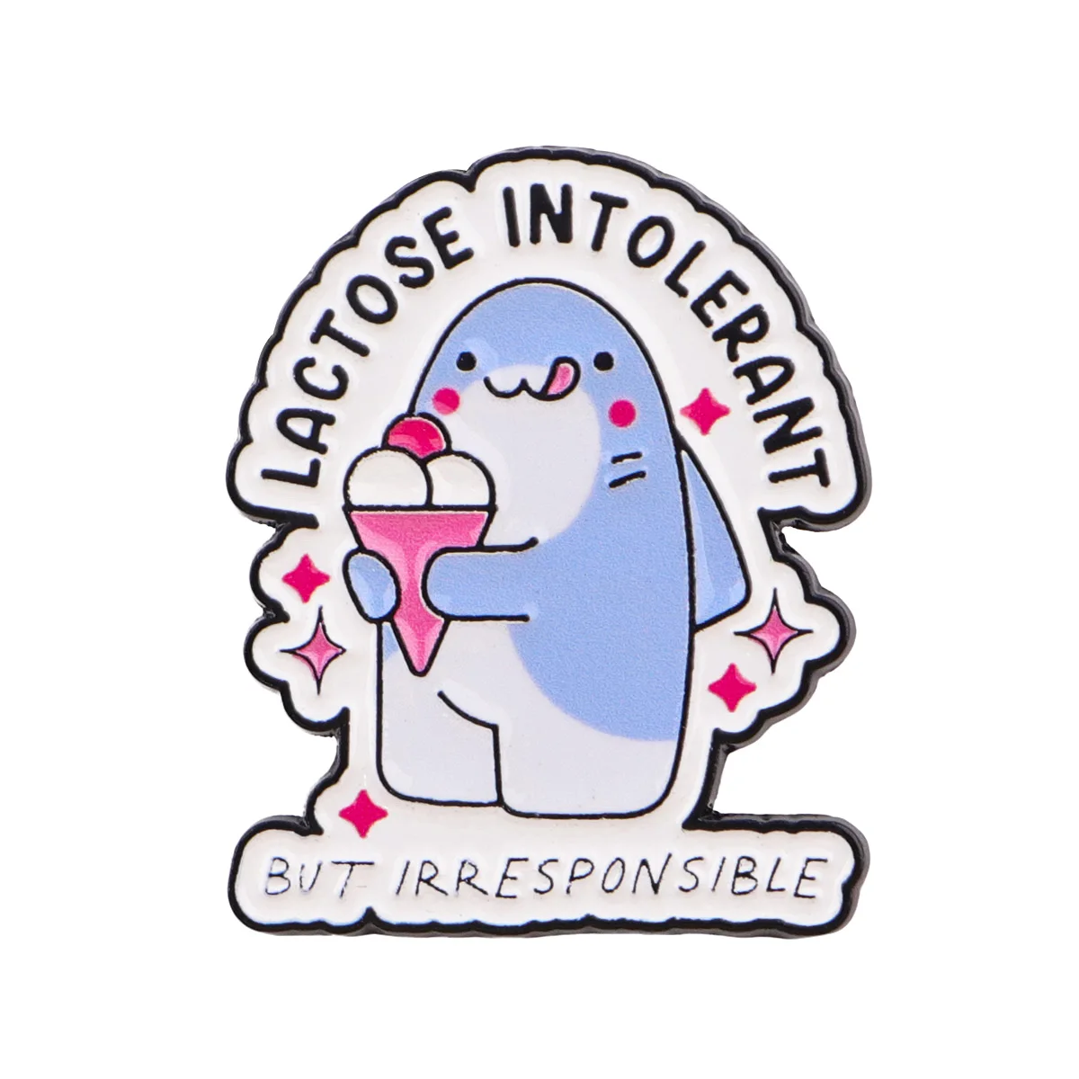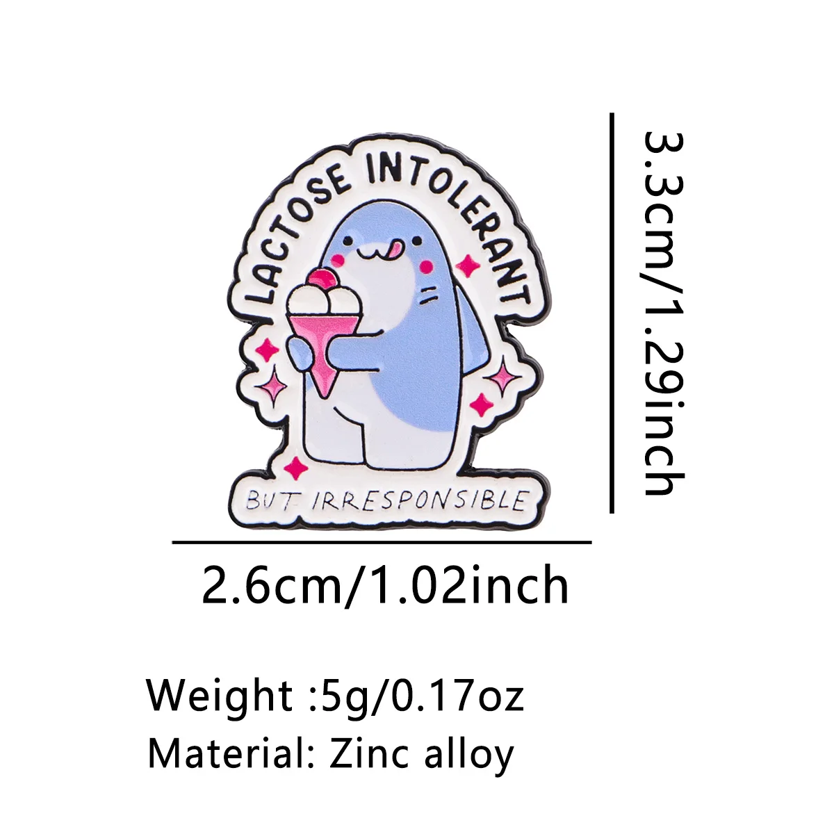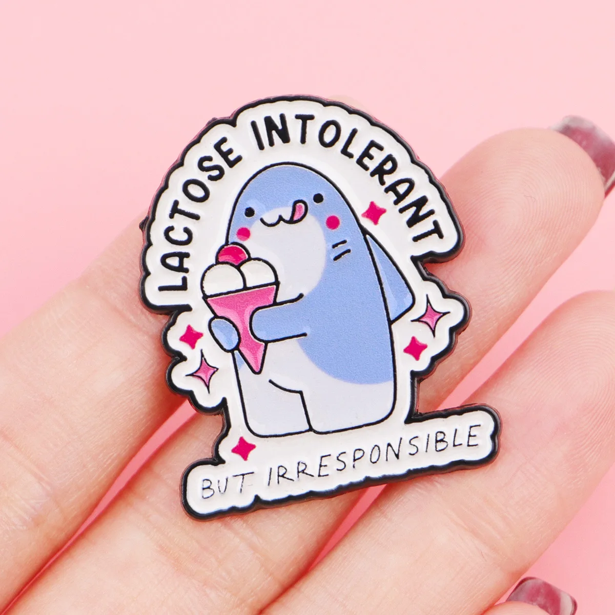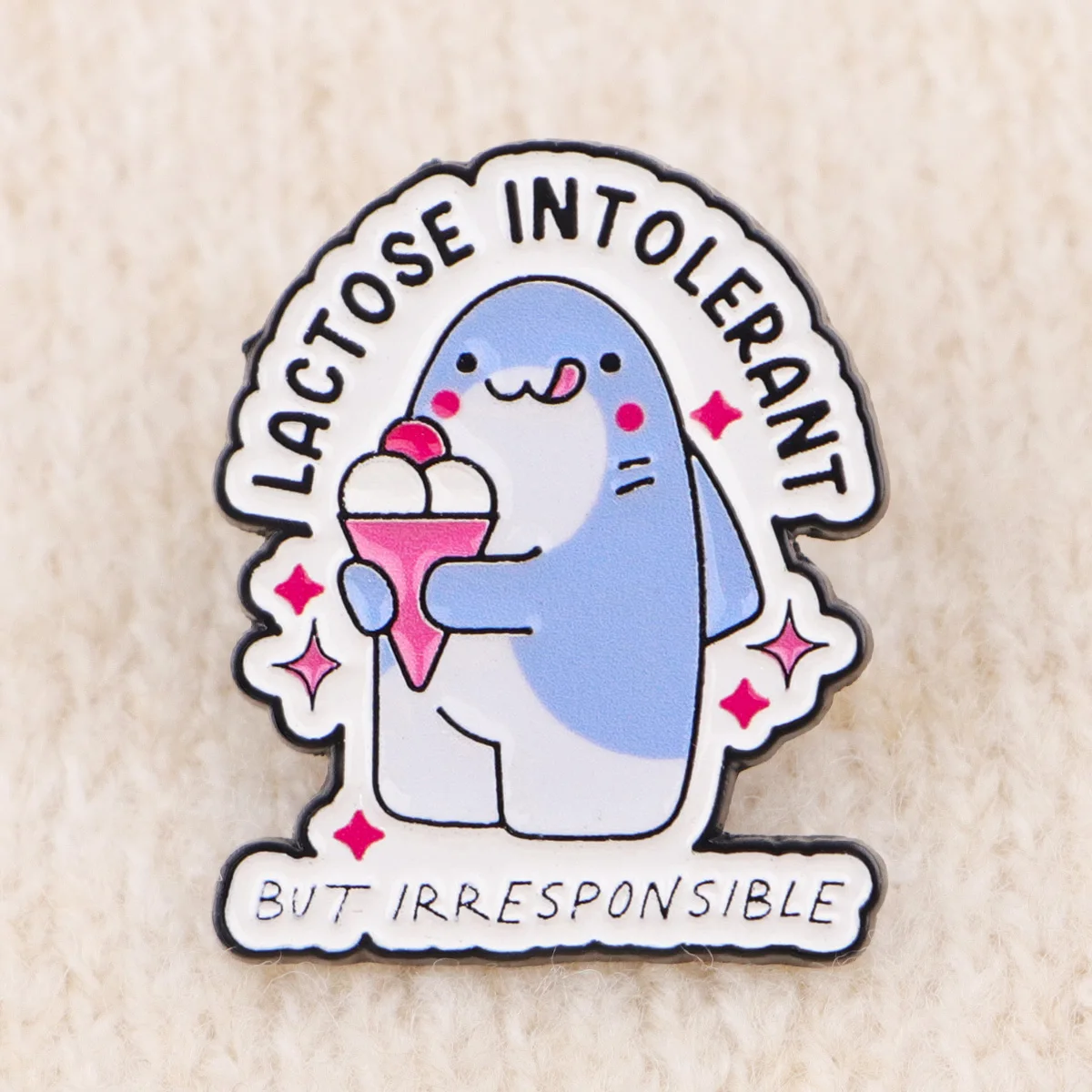 Pin de Esmalte con Diseño de Tiburón de Dibujos Animados con la Frase 'Pero Irresponsable', para Insoportables al Lactosa, Ideal para Chaquetas, Mochilas y como Regalo