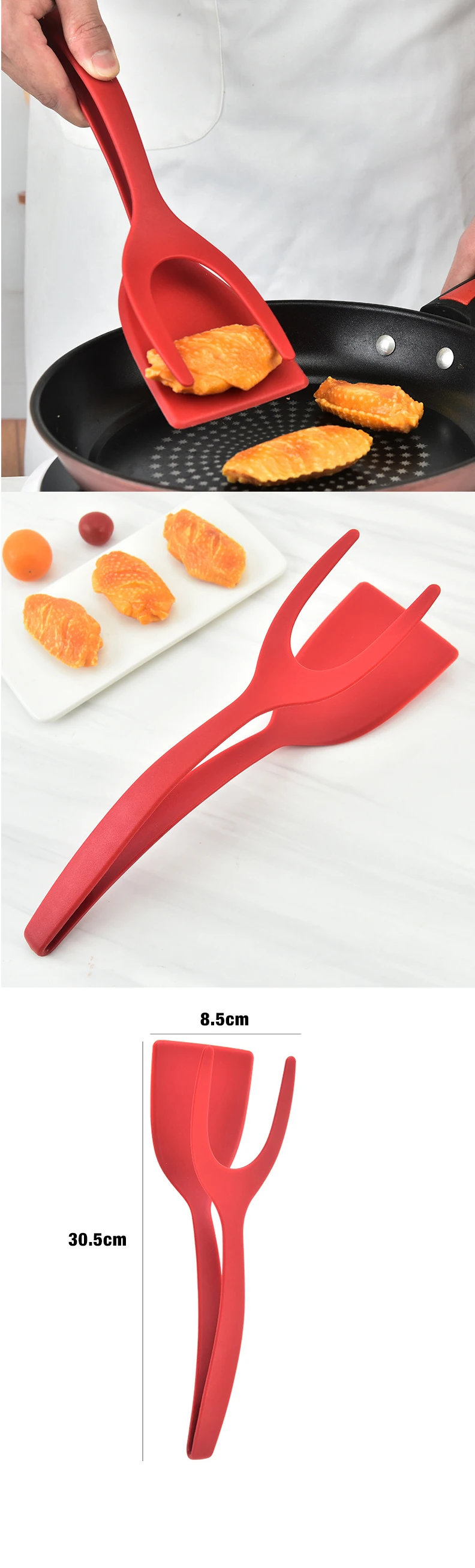 La espátula y las pinzas de cocina 2 en 1 de grado alimenticio, hacen fácil girar y coger los alimentos.