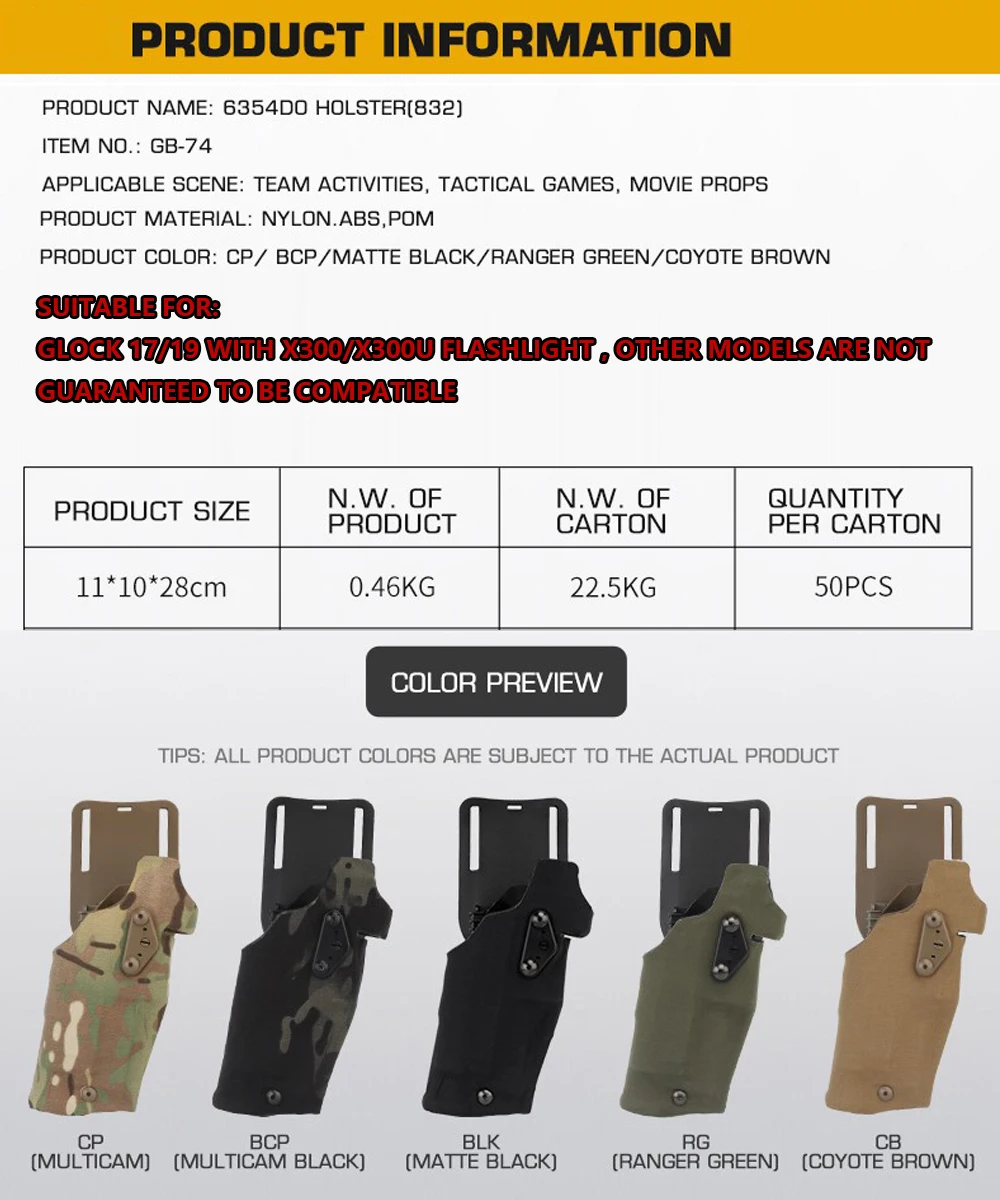- Compatibilidad del producto: solo apto para productos Glock 17 de cuarta generación con linterna x300/x300u, no se garantiza la compatibilidad con otros modelos.