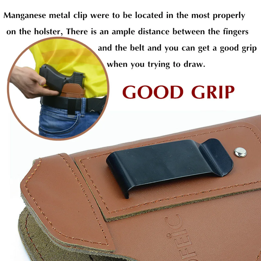 El clip de metal de manganeso se ubicaría de la manera más adecuada en la funda, hay una amplia distancia entre los dedos y el cinturón y puede obtener un buen agarre cuando intenta dibujar