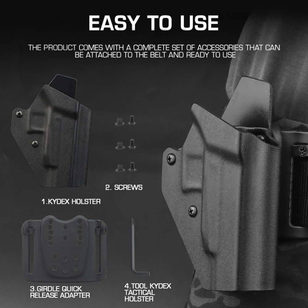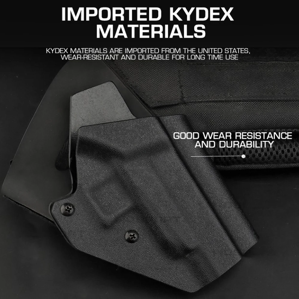 La funda de pistola está hecha de material KYDEX importado de los Estados Unidos, que tiene las características de ligereza, resistencia al desgaste y resistencia a altas temperaturas. ¡Es muy popular entre los fanáticos militares internacionales y los entusiastas del aire libre!