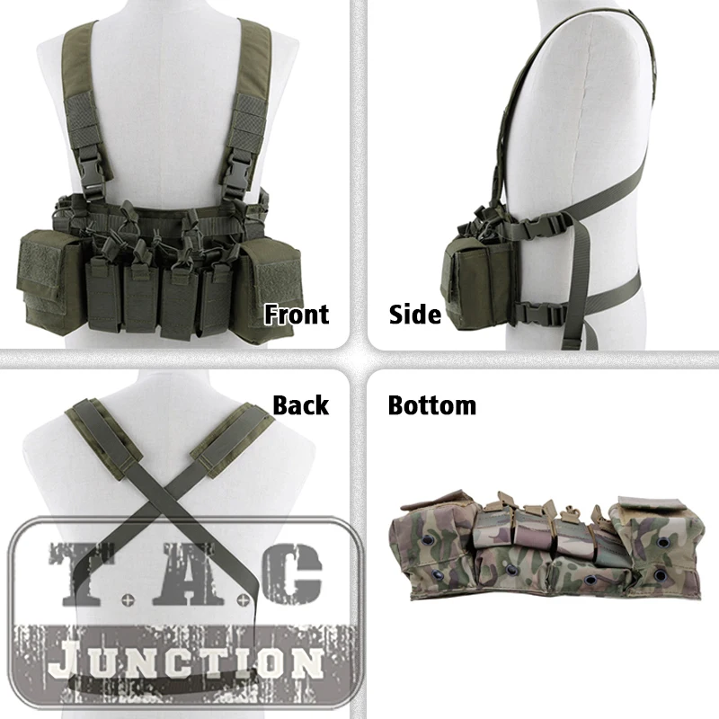 * Se agregó el arnés X para mayor comodidad y ajuste final.* Las 4 bolsas para revistas de rifle aceptan revistas tipo AR, así como revistas AK de 7,62x39mm y 5,45x39.* 4 bolsas multimisión aceptan 1911, Glock, Sig, M & P, XD y otras revistas de pistola estándar de pila simple o doble, así como muchas luces de mano, multiherramientas, y granadas de 37mm/40mm.* 2 bolsas multimisión permiten que la plataforma sea más aerodinámica y lleve los elementos esenciales de la Misión donde cuentan.* El panel frontal se puede utilizar con portaplacas y mochila D3.El paquete incluye:1 aparejo de pecho de asalto táctico