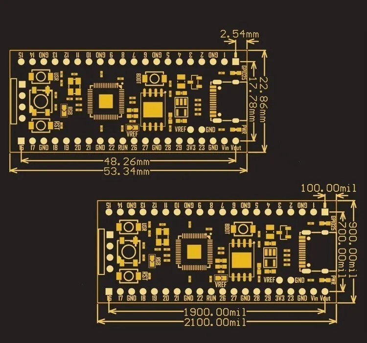El microprocesador (MCU) RP2040 integra un núcleo Cotex-MO+ de arquitectura ARM de doble núcleo, integra directamente 264 KB de RAM, admite hasta 16 M de Flash de expansión externa QSPI, configuraciones de E/S altamente flexibles, incluidas l2C, SPI, PIO (E/S programables);La placa central YD-RP2040 es una placa de circuito central hecha de microprocesador (MCU) RP2040, que es conveniente para que los usuarios realicen expansión periférica, diseño de circuitos y construcción.Raspberry Pi también ha lanzado su propia placa central RP2040 oficial, el modelo es la placa central Raspberry Pi Pico, la placa central YD-RP2040, que puede lograr ningún resultado de reconocimiento con el núcleo Ra en términos de tamaño mecánico y pines eléctricos.La placa es compatible para su uso, consulte la información para obtener más detalles sobre las diferencias y mejore una serie de deficiencias de la placa central Raspberry PiPico: