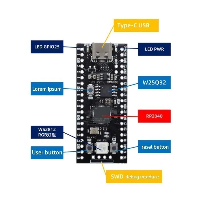 ●Cambie la interfaz microUSB de Raspberry Pi Pico a Type-C de la placa central YD-RP2040, la interfaz USB es conveniente para que los usuarios encuentren cables USB relacionados de manera más conveniente.