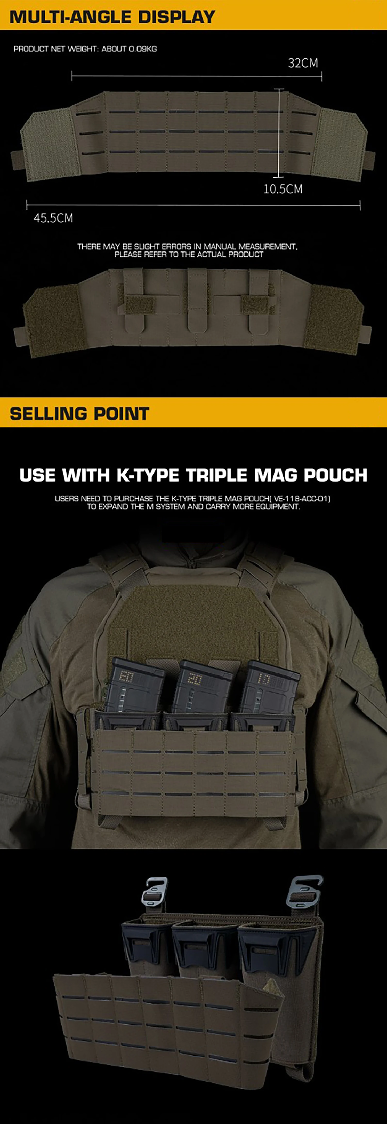 Amplíe su capacidad de carga: esta es la segunda capa del sistema modular tipo K.Se instala directamente en la parte frontal de su bolsa KZ Triple Mag (capa base, necesaria, se vende por separado), agregando un panel MOLLE completo (32 cm x 45,5 cm) para montar equipos adicionales sin cambiar la configuración del núcleo.