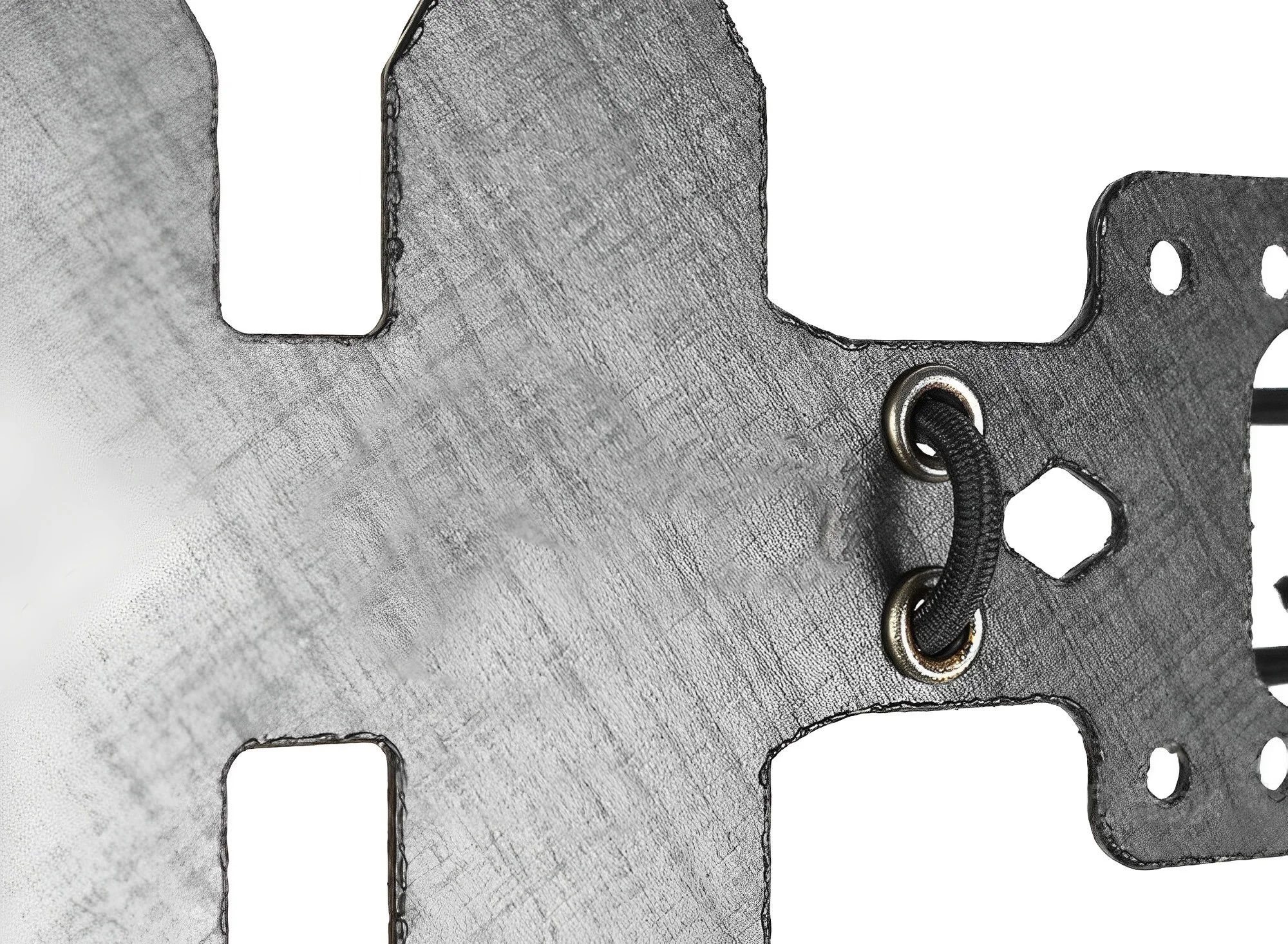 Usando la cuerda de choque, el trineo Comm tira del borde exterior del PTT hacia el espacio intercostal del portador de la placa y lo mantiene espaciado para que los dispositivos EUD se puedan usar sin interferencias de PTT más grandes.
