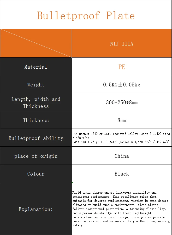 Las placas de armadura rígida garantizan una durabilidad a largo plazo y un rendimiento constante. Esta resistencia los hace adecuados para diversas aplicaciones, ya sea en climas áridos del desierto o en ambientes húmedos de la jungla. Las placas rígidas ofrecen una protección excepcional, una flexibilidad excepcional y una durabilidad superior. Con su construcción liviana y diseño contorneado, estas placas brindan comodidad y maniobrabilidad inigualables sin comprometer la seguridad.