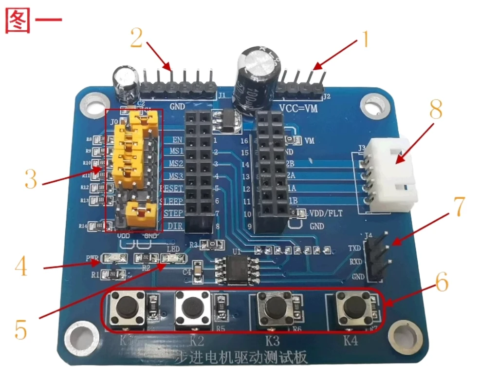 1.El módulo de accionamiento del motor paso a paso funciona con VDD y se conecta a los 5V de la placa a través de una resistencia 0R.