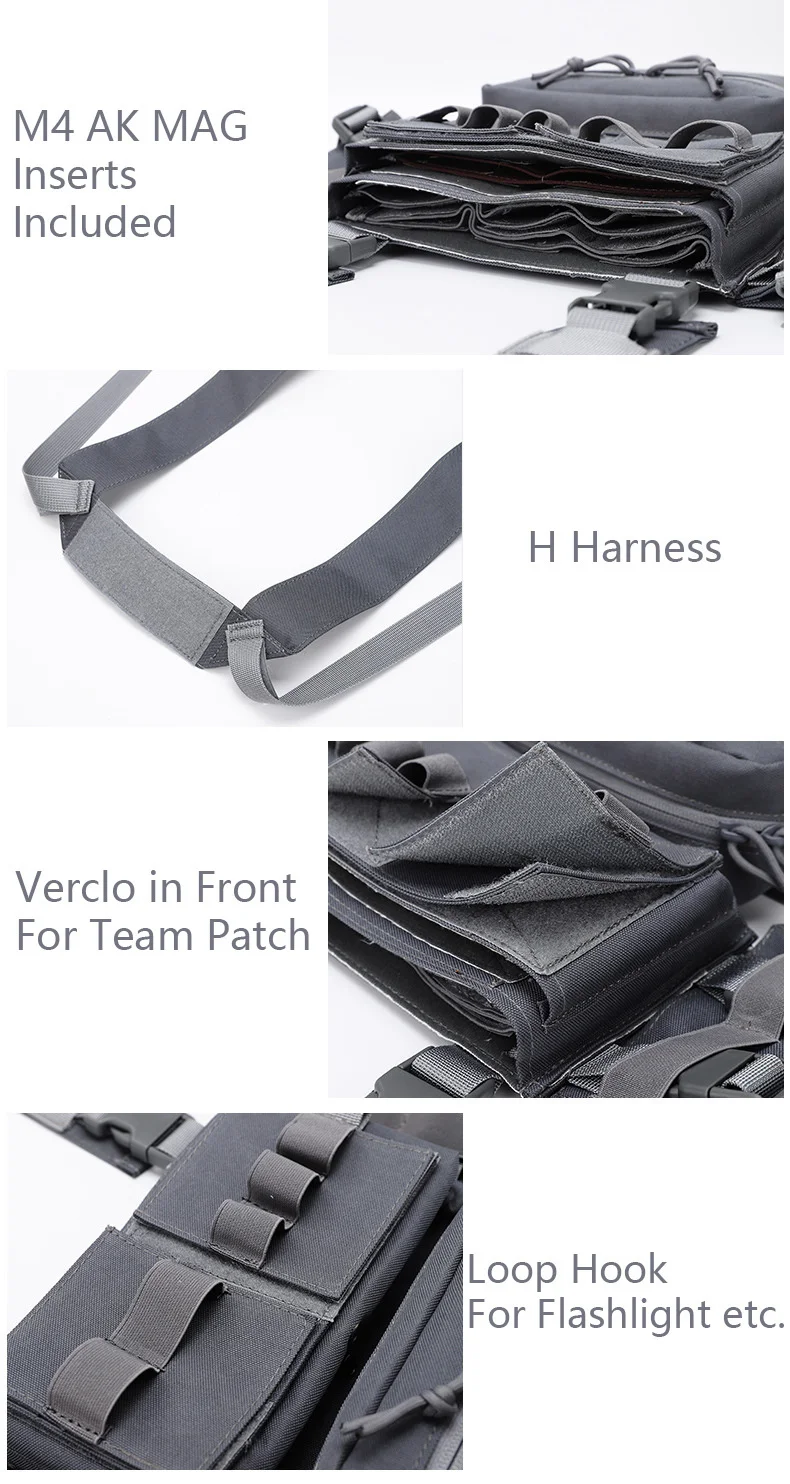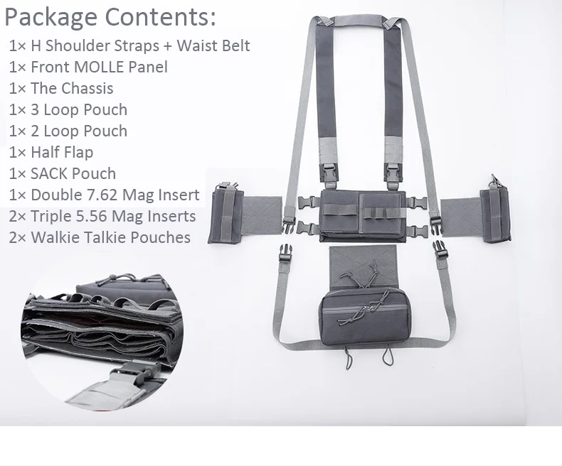 Admite llevar 6 revistas 5,56 o 2 revistas 7,62 o 2 radios de dos vías. El gancho y el lazo en la parte posterior están diseñados para la bolsa S.A.C.K. o portadores de placas de posventa.