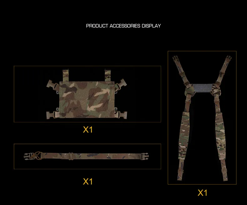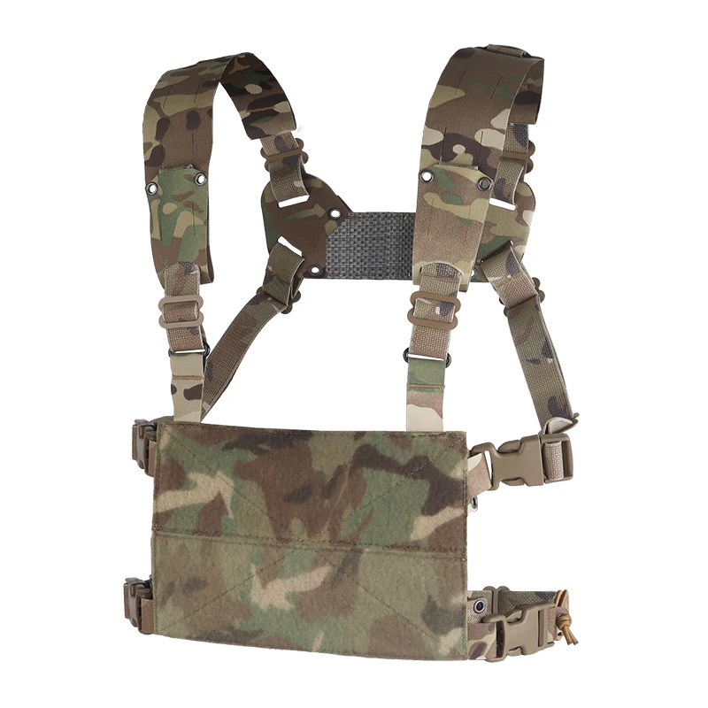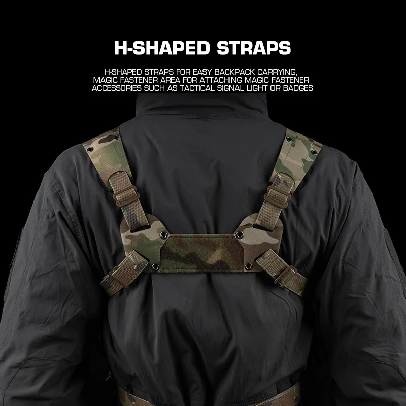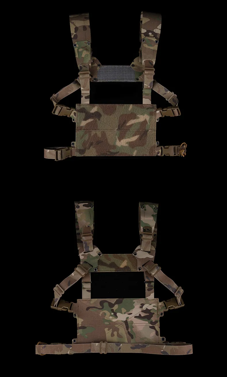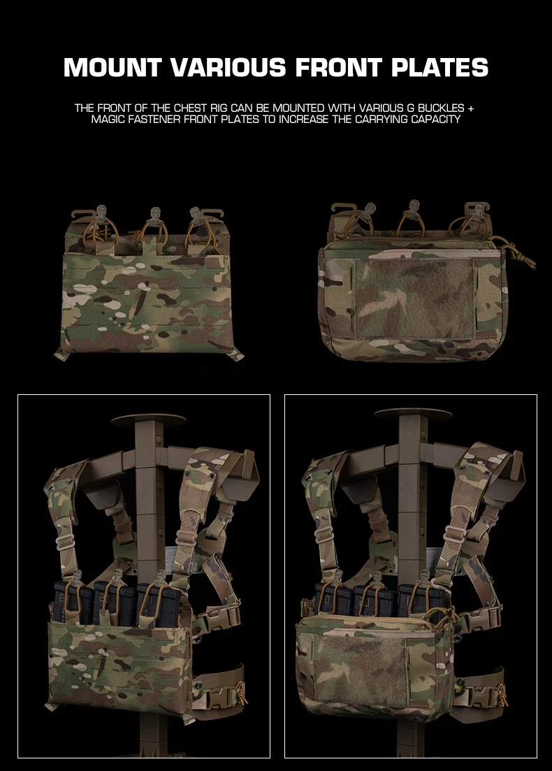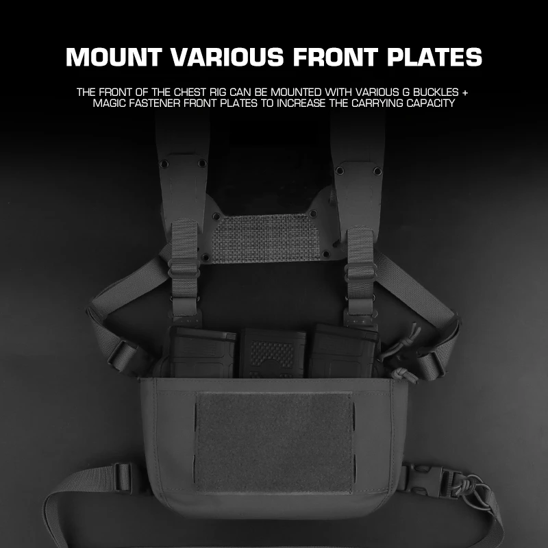 La parte delantera del aparejo para el pecho se puede montar con varias hebillas G + placas frontales con cierre mágico para aumentar la capacidad de carga.