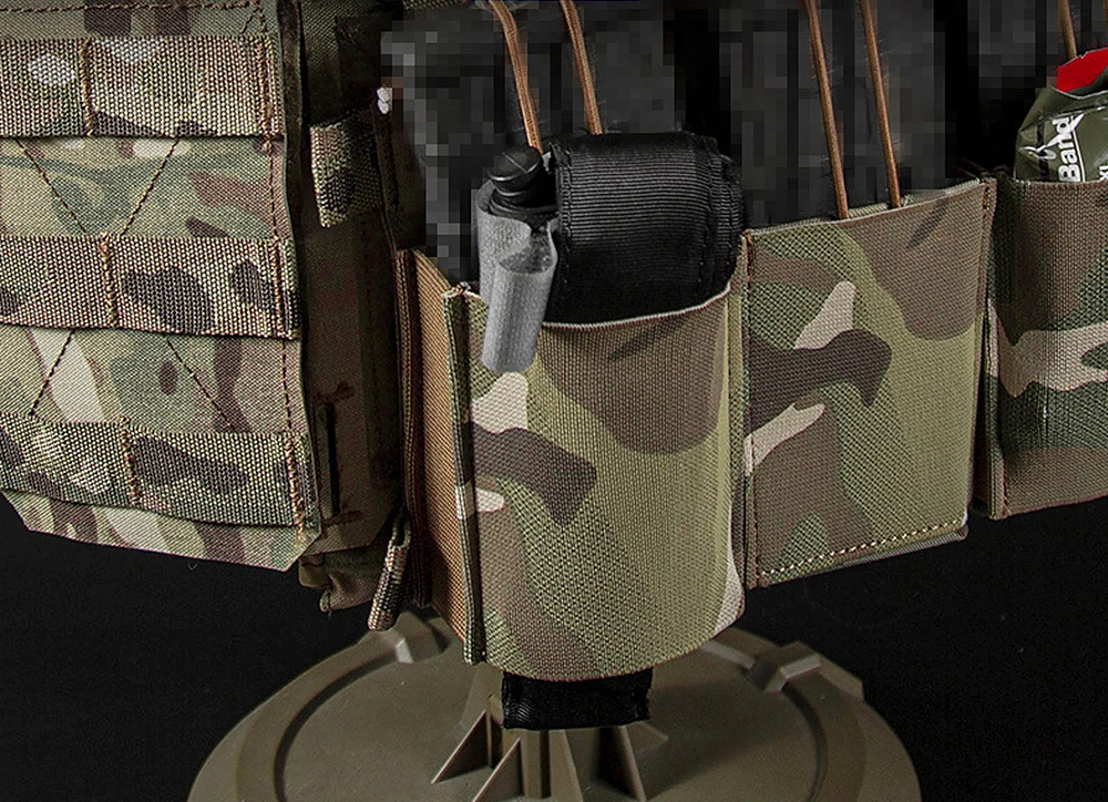 ④ Bolsa de revista frontal desmontable TRMP 5,56 con inserciones y cordón elástico, y bolsillos frontales elásticos para almacenamiento de perfil bajo.
