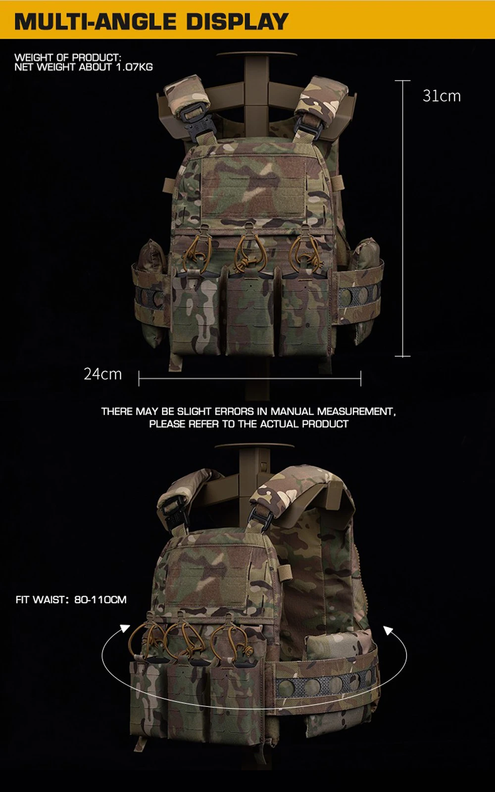 Nombre del producto: chaleco táctico V5 para PC Número de artículo.:VE-75 Tamaño del producto: 36*24*46cm Peso neto del producto: 1,07 KG Color del producto: negro mate/gris lobo/verde Ranger/marrón coyote/MC/MCBK Material principal: tela Cordura, velcro. Escena aplicable: militar, caza, deportes al aire libre y otros deportes tácticos de airsoft, etc.