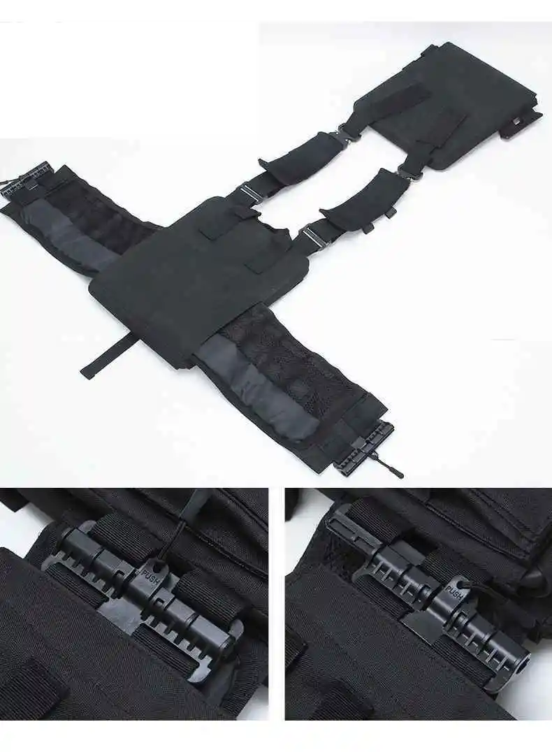 El material es suave y cómodo, resistente al desgaste y a los arañazos. SISTEMA DE MONTAJE MOLLE TRASERO Potente sistema de montaje, se puede combinar libremente Diseño elástico de la cintura trasera Reacción rápida para completar varios movimientos para garantizar la estabilidad del chaleco Ajuste rápido, colocación y retirada rápidas El hombro se puede ajustar rápidamente para su uso Cierre de liberación rápida, tire del cordón hacia afuera, hacia abajo. Deslice hacia arriba Deslice hacia arriba y hacia abajo para abrir la hebilla de liberación rápida para salir de problemas y desmontar Apertura del cordón inferior para reemplazar el bisel con un tirón Material principal: tela mate/tela CORDURA