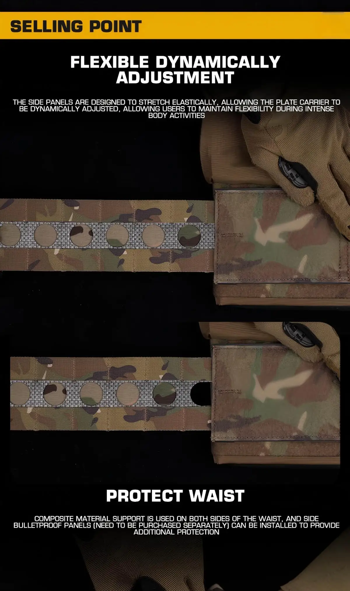 Ajuste dinámico y estabilidad: nuestros destacado paneles laterales elásticos se estiran y flexionan dinámicamente con su cuerpo, brindando flexibilidad y comodidad inigualables durante los sprints, inmersiones o escaladas.El soporte de material compuesto en la cintura ofrece rigidez estructural y protección, con disposiciones para agregar placas de blindaje laterales (se venden por separado) para una cobertura integral.