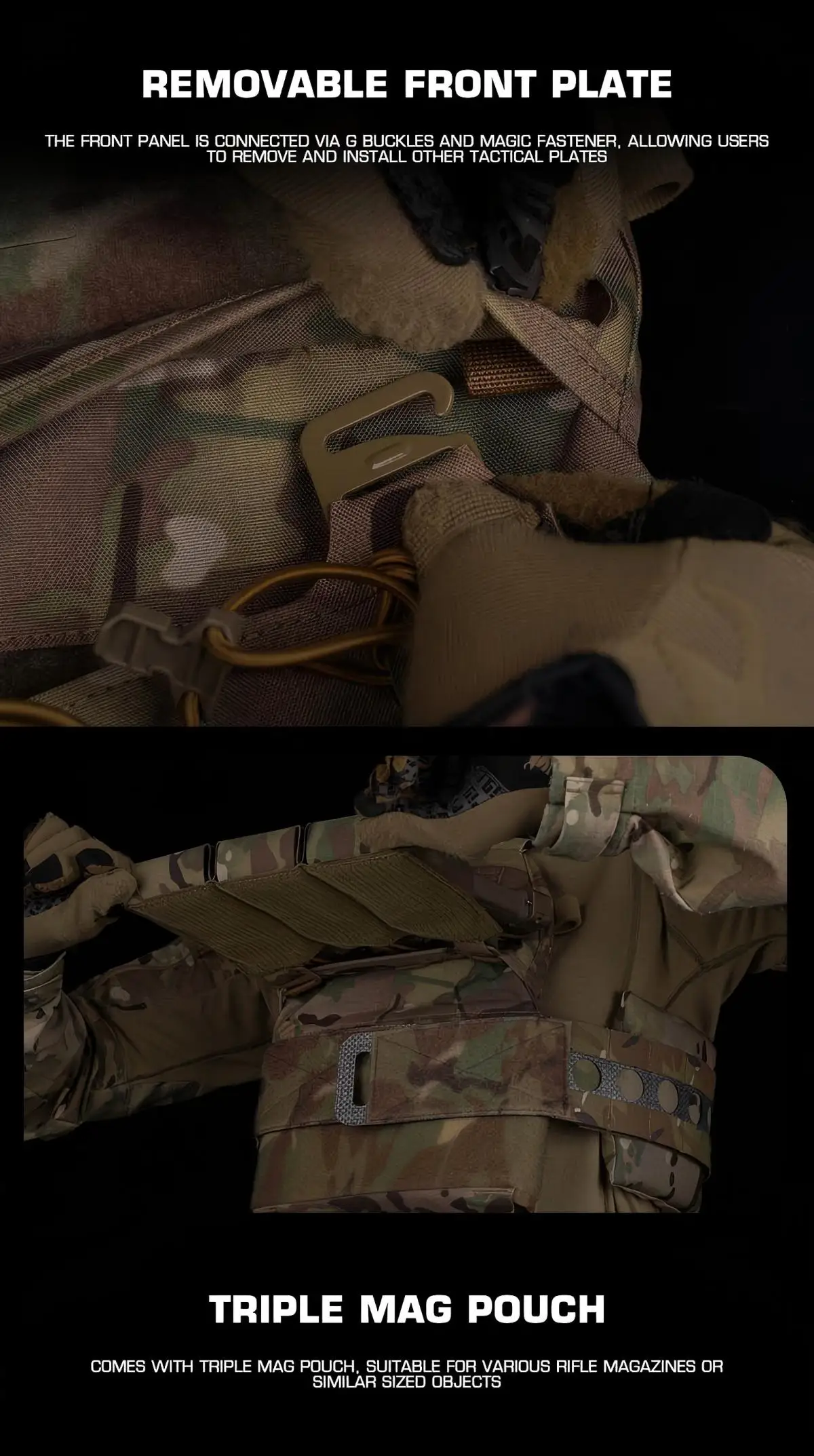 Velocidad y modularidad integradas: nunca más buscar revistas.La bolsa para cargador triple Quick-Pull incorporada y no extraíble ofrece acceso instantáneo a sus municiones primarias.Junto con un panel de placa frontal extraíble (instalado mediante ganchos en G y gancho y bucle), puede cambiarlo rápidamente a diferentes paneles configurados para necesidades específicas de misión.