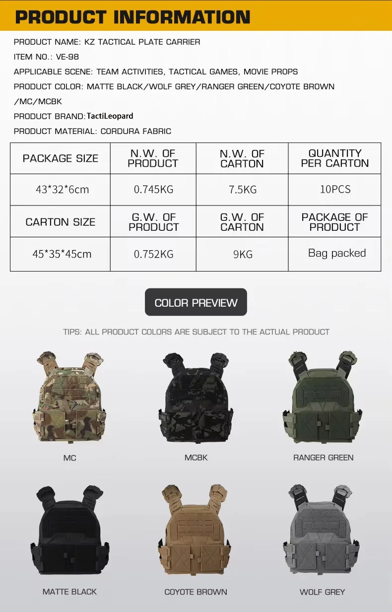Lista de productos: 1 soporte para placas, sin incluir placas antibalas ni bolsa frontal.