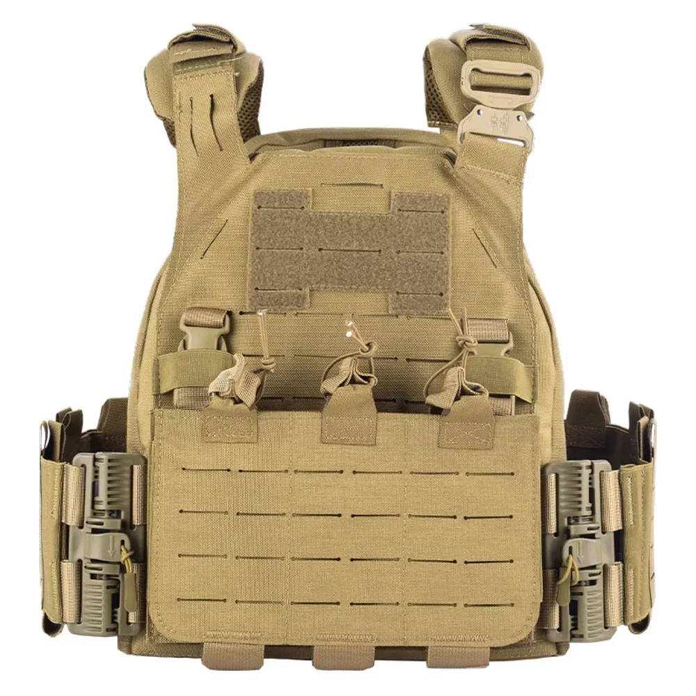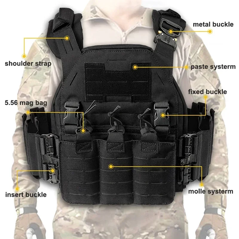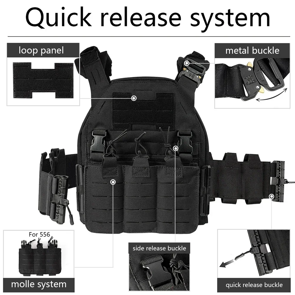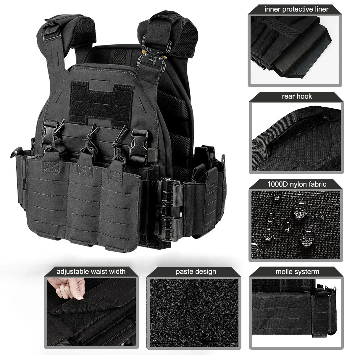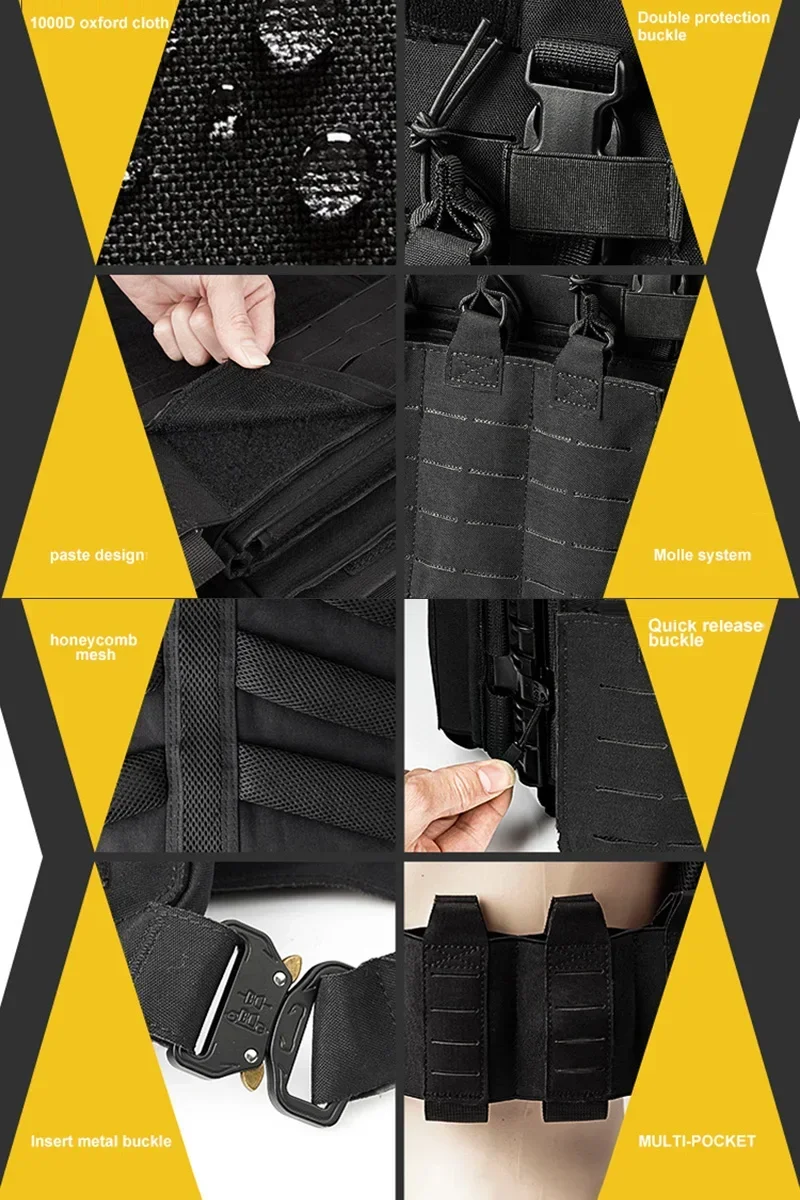 Material: nailon 1000D Tamaño: Chaleco A: aproximadamente 40*30cm Chaleco B: alrededor de 27*33cm El cinturón en sí es estirable y elástico y se puede ajustar. La distancia entre el pecho y la espalda generalmente es de unos 24cm en estado natural sin estiramiento, y la distancia también se puede ajustar mediante el cinturón y la posición de pegado del panel trasero. Características: 1. Baja visibilidad usable por dentro y por fuera. 2. Material de nylon 1000D de alta calidad, secado rápido, transpirable, impermeable, resistente al desgaste. 3. Ligero: incluye placas protectoras EVA insertadas, se puede combinar con otras placas de material (placa de acero/PE/Cerámica, etc.). 4. Sistema de liberación rápida, multifuncional y desmontable según sea necesario. 5. Gran regalo para fanáticos militares y el mejor para el entrenamiento de combate CS al aire libre. 6. Tamaño adecuado: adecuado para una circunferencia de cintura de aproximadamente 80 ~ 120cm, aproximadamente 50 ~ 100kg para un cuerpo normal, se pueden ajustar los hombros y la cintura.