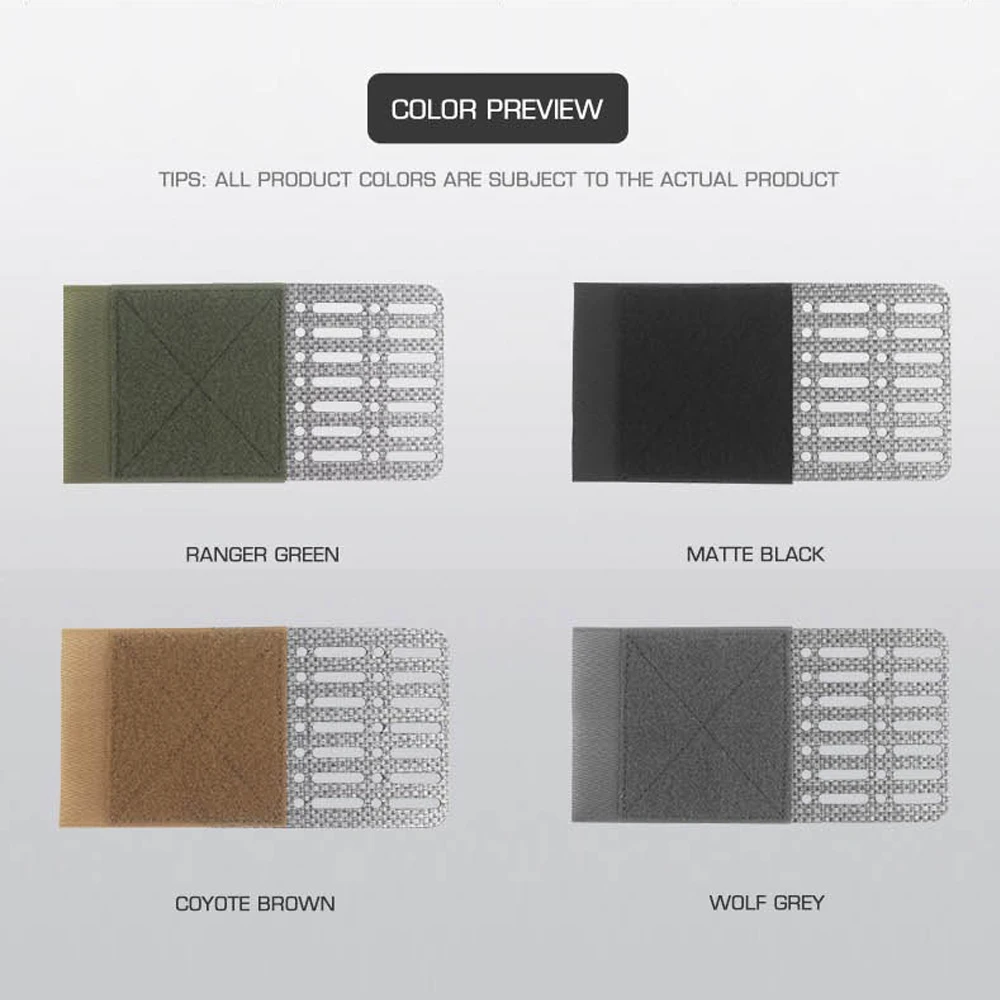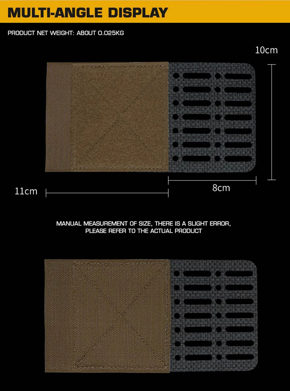 Nombre del producto: placa lateral extendida Número de artículo.:VE-ACC-20 Tamaño del producto: 20*10*1CM Peso neto del producto: 0,025 KG Peso bruto del producto: 0,052 KG Color del producto: verde Ranger/negro mate/marrón coyote/gris lobo. Material principal: sujetador mágico de fibra Escena aplicable: caza, deportes al aire libre y otros accesorios tácticos de atletismo Airsoft CS, etc.