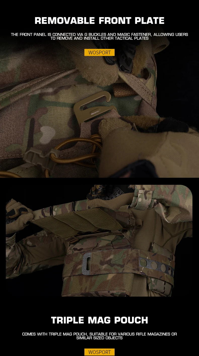 5.El panel frontal se fija mediante hebillas G y gancho y bucle, lo que permite a los usuarios quitar e instalar fácilmente otros paneles tácticos.