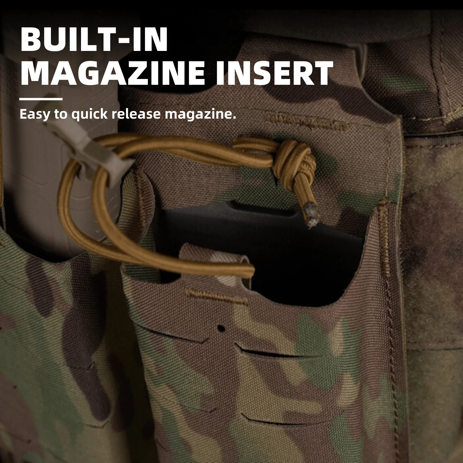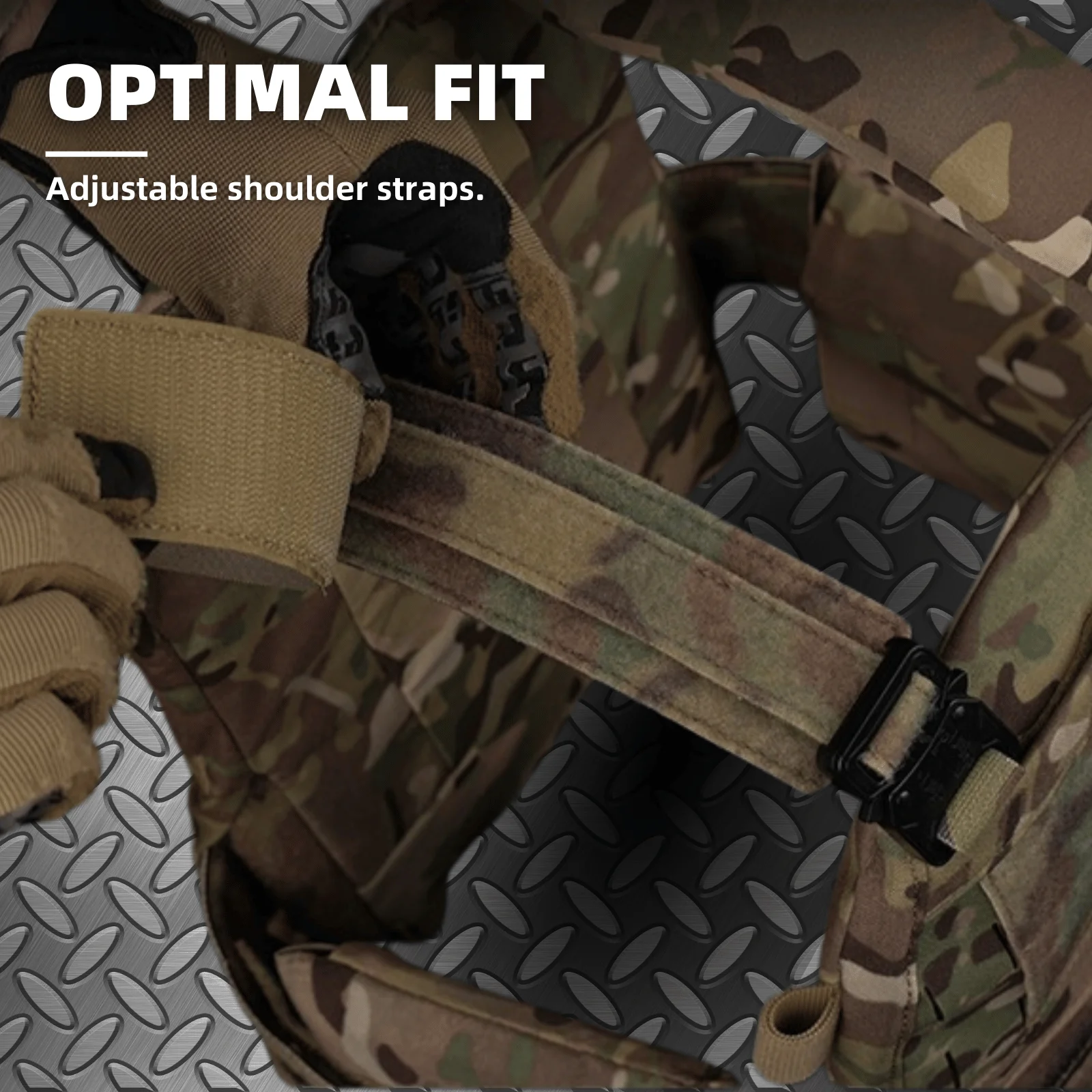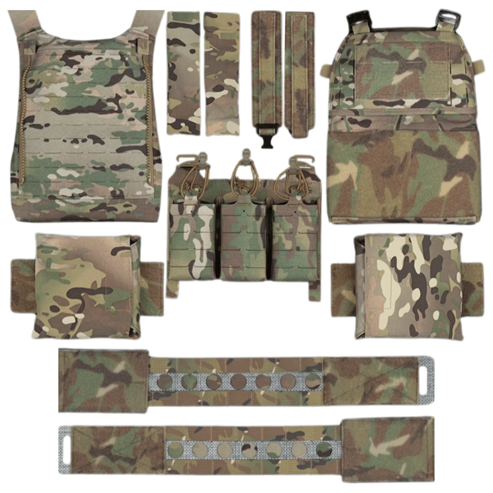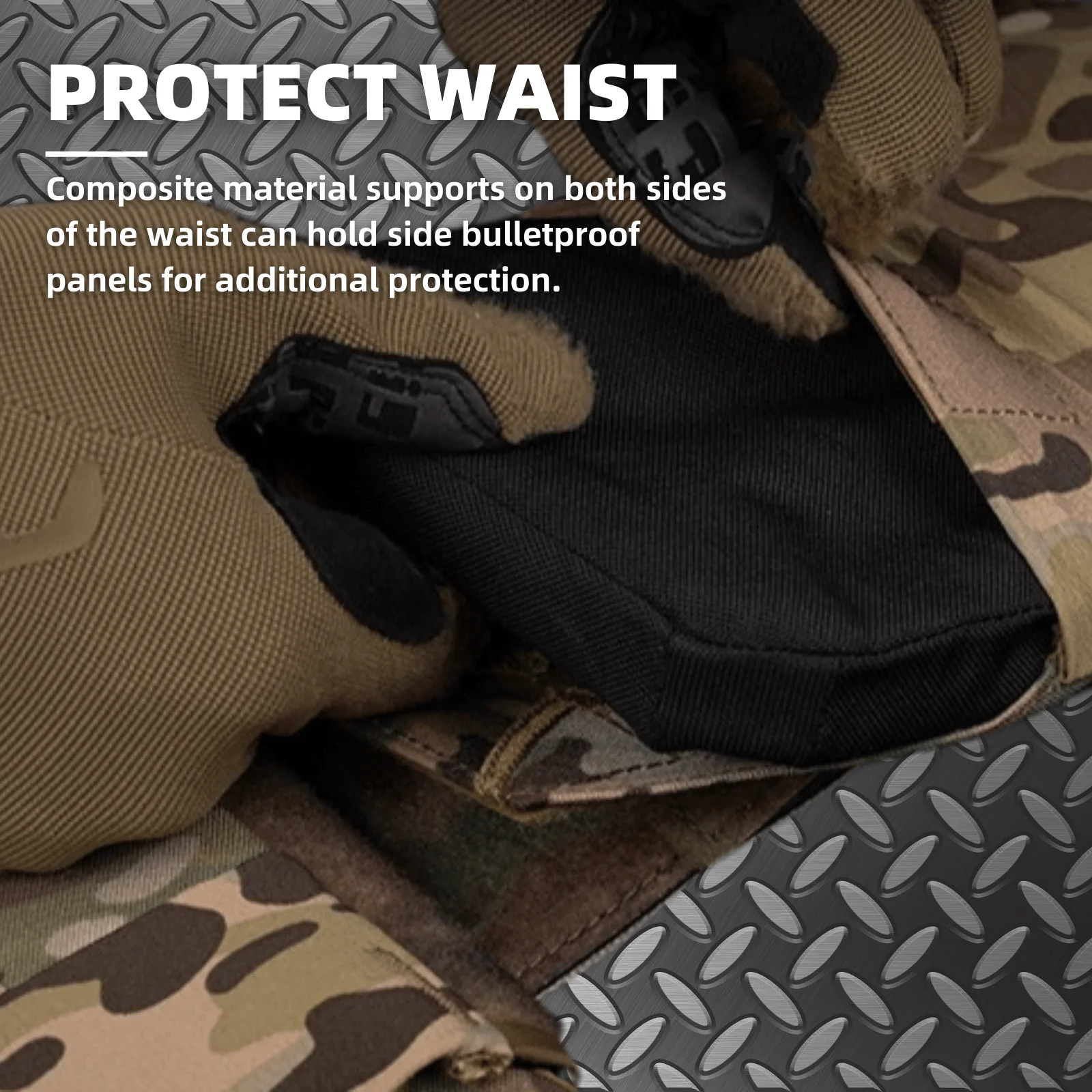 Los soportes de material compuesto en ambos lados de la cintura pueden contener paneles laterales antibalas para protección adicional.