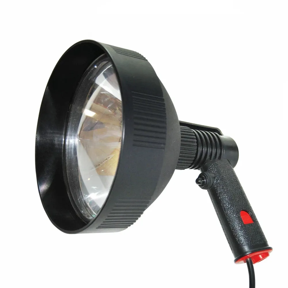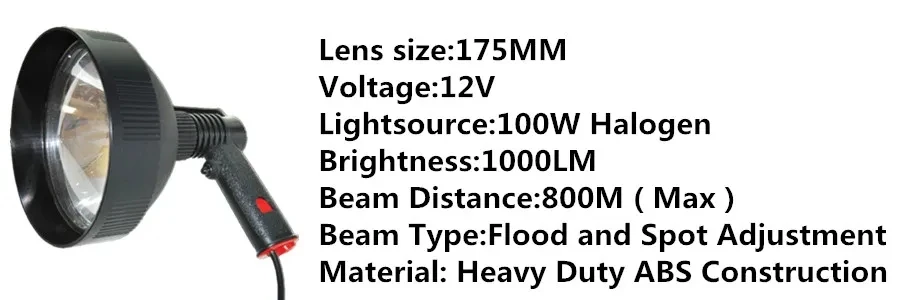 The HH7''-100W is a 100Watt Halogen handheld spotlight that emits 1000 lumens. Its ideal applications wouldinclude recreational boating, fishing, hunting, search and rescue and security. This spotlight produces a beam capable of expanding to 400-800 Meters. This lightweight, ultra rugged, ergonomic spotlight operates on 12 volts Direct current and can be used as a spot or flood light.