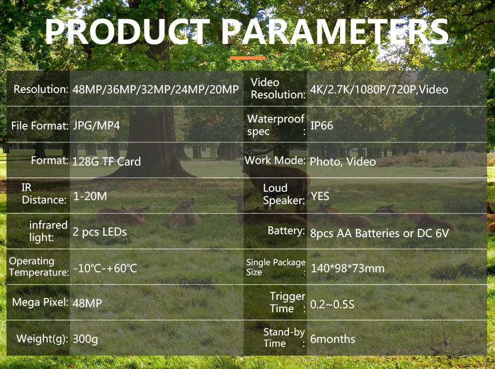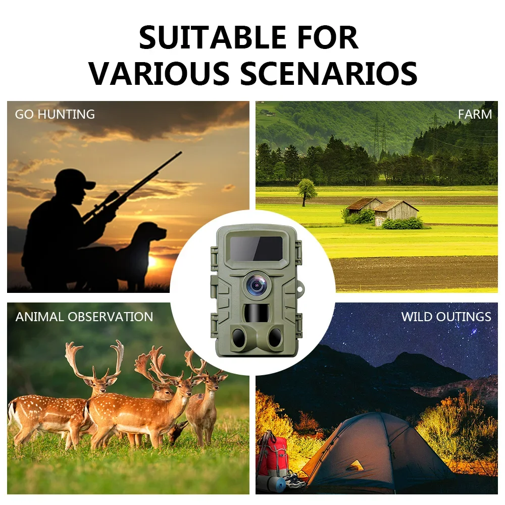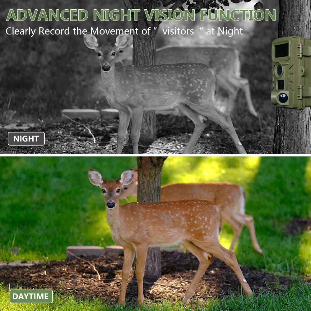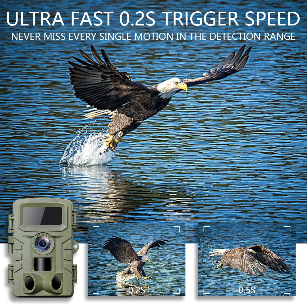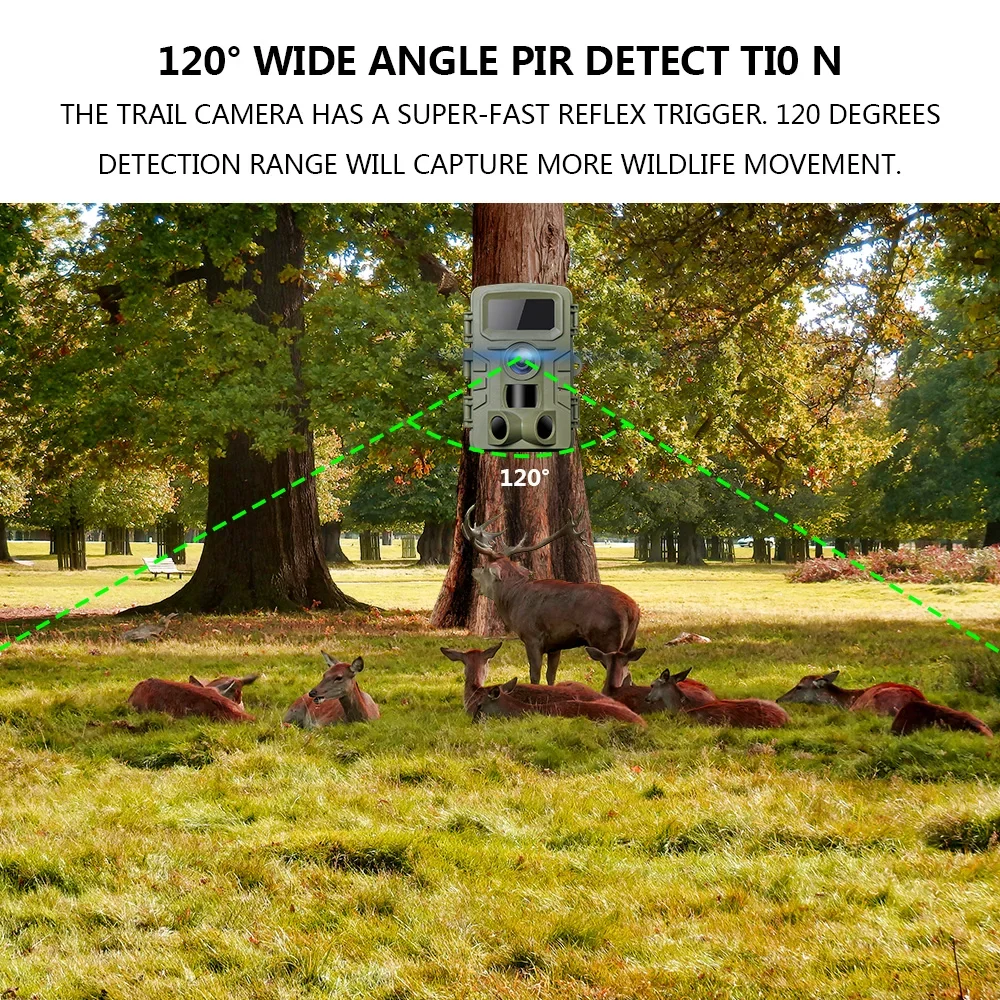 Con un gran ángulo de 120 grados, esta cámara te ayuda a disparar en campos abiertos.El rápido 0.2~0.La velocidad de disparo de 5 segundos garantiza que pueda capturar objetivos en movimiento rápido en las propiedades de caza y el flash infrarrojo invisible (también llamado flash negro), que es perfecto para capturar fotos y videos con detección cero de esos animales tímidos con cámara.