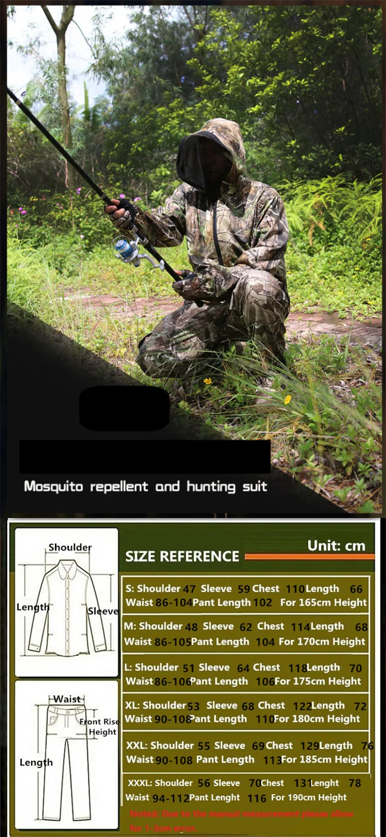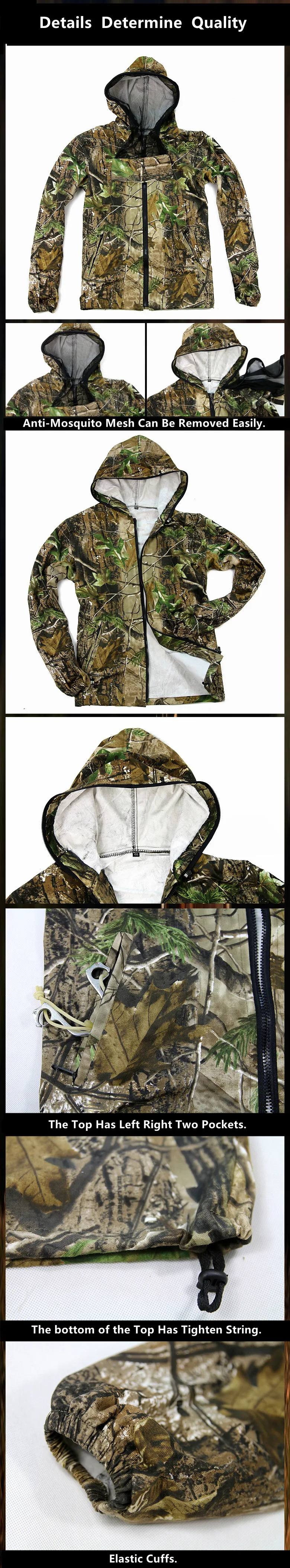 * Tejido de poliéster y algodón de buena calidad, transpirable, cómodo y portátil.* Antimosquitos* Buen camuflaje, apto para caza, pesca, tiro...* Adecuado para primavera, otoño.