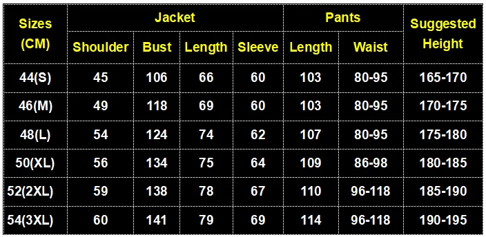 Tipo de traje: chaqueta + pantalones, chaqueta + pantalones + sombrero + bufanda + guantes