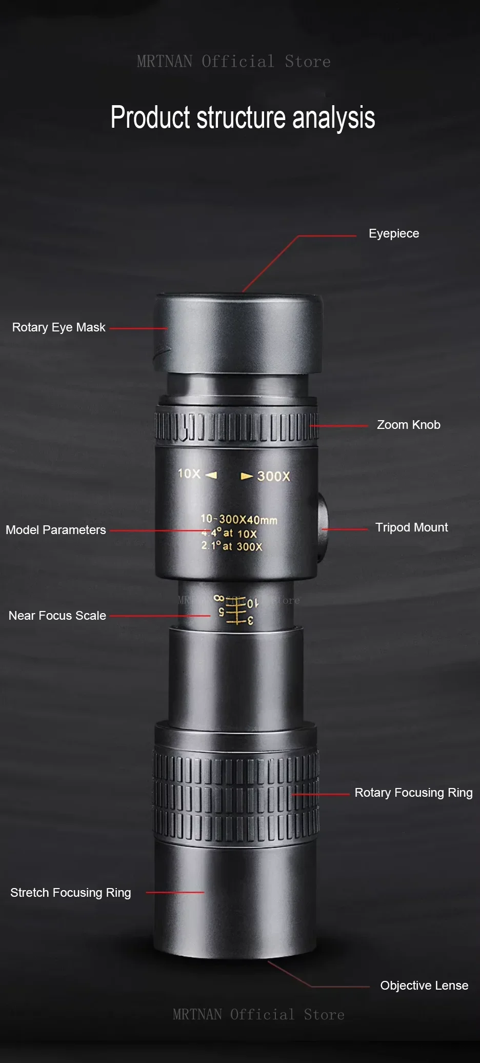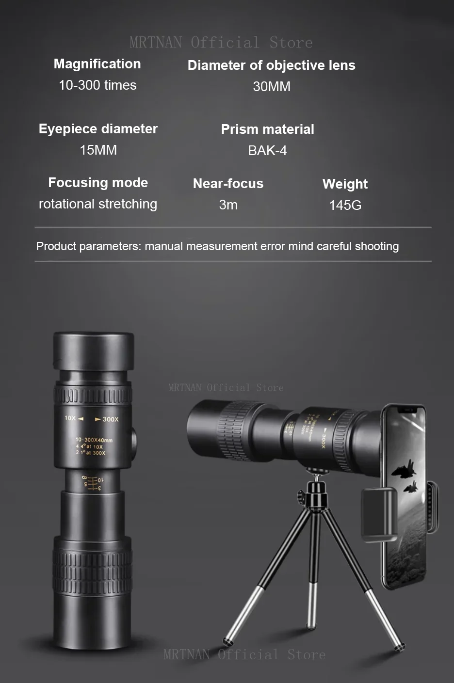 High Power 10-300x40 Monocular Telescope Long Range Zoom BAK4 Prism With Tripod Phone Clip For Outdoor Camping Hunting