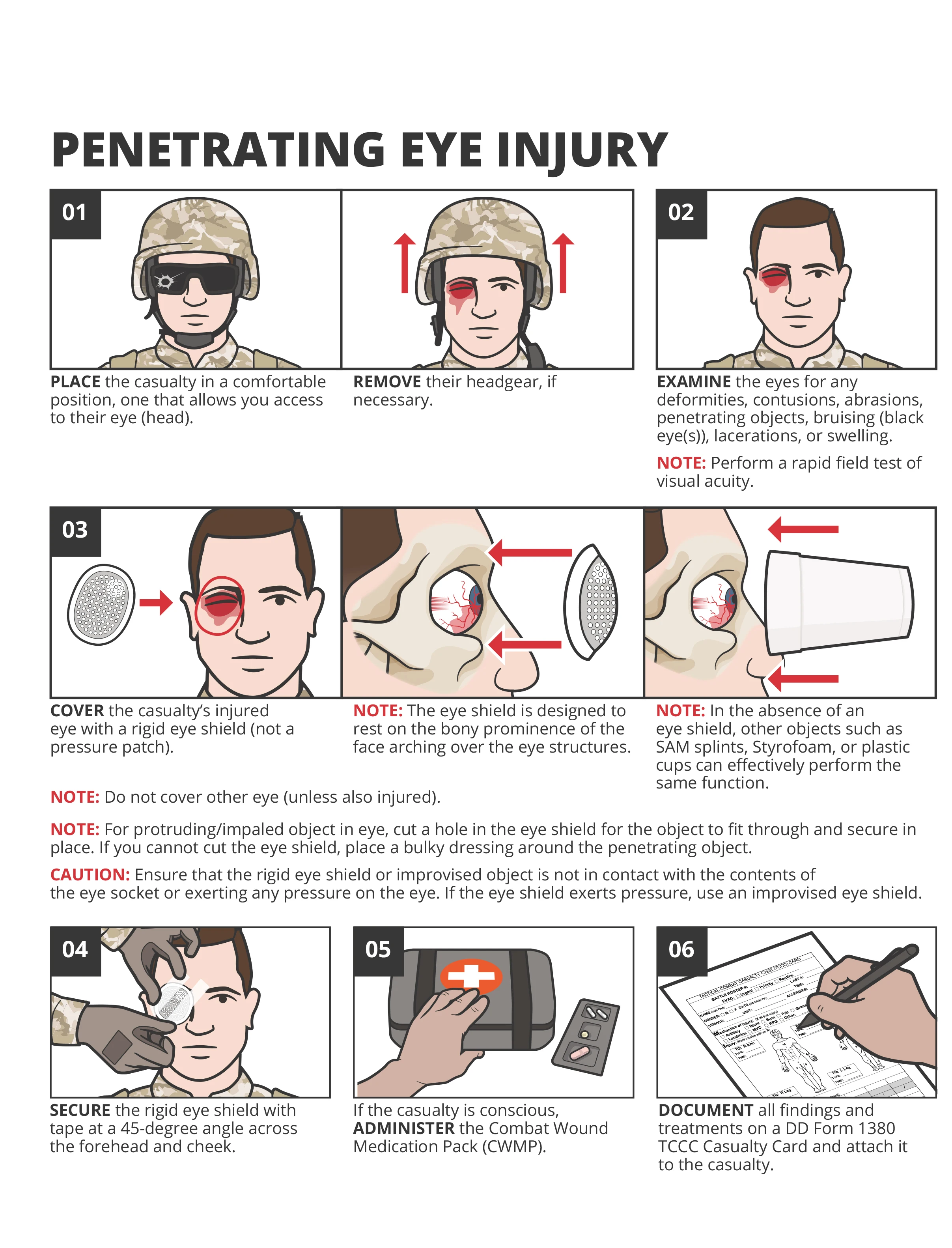 Rhino Eye Shield, also known as The Rhino screen, is a malleable and light weight perforated metal screen that is frequently placed over an injured or postoperative eye. White Protective Cloth Cover enhances comfort for the wearer. TCCC Guidelines as written for Tactical Field Care, regarding Penetrating Eye Trauma: "If a penetrating eye injury is noted or suspected: a) Perform a rapid field test of visual acuity. b) Cover the eye with a rigid eye shield (NOT a pressure patch)."