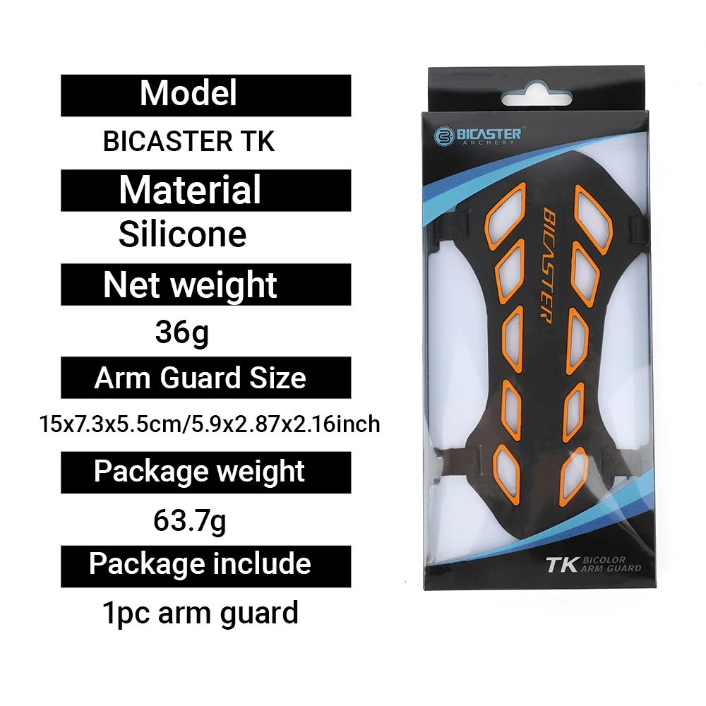 Nombre del artículo: Protector de brazo de tiro con arco Modelo: BICASTER TK Color: blanco + rosa, blanco + azul, negro + blanco, negro + azul, negro + verde, negro + naranja, negro + rojo Material: silicona Tamaño del protector del brazo: 15x7,3x5,5 cm/5,9x2,87x2,16 pulgadas Peso neto: 36g Peso del paquete: 63,7 g Tamaño del paquete: 8,5x20x1,7 cm El paquete incluye: 1 protector de brazo