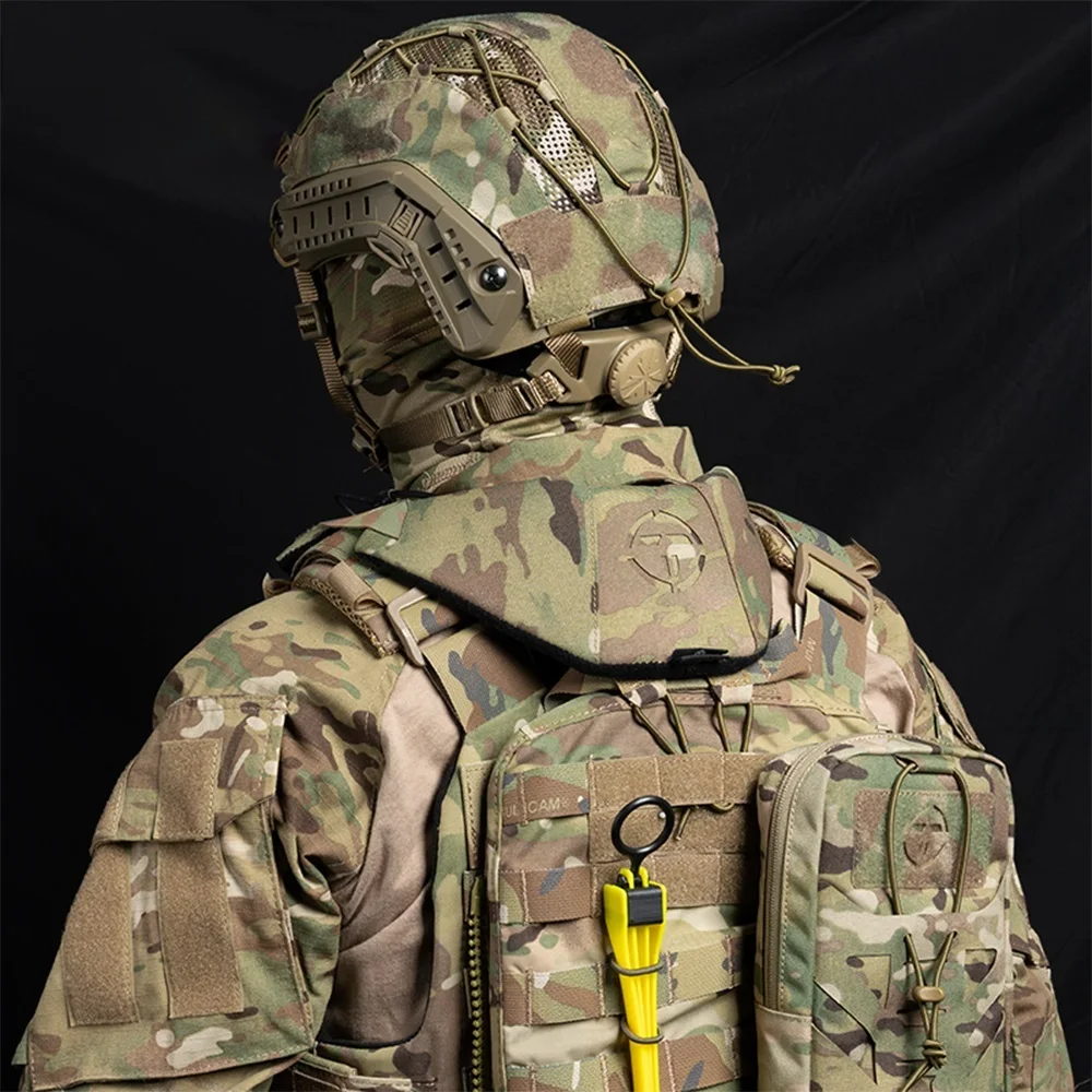 Los frontales están cosidos en superficies del sistema de aro y bucle, de modo que se puedan colocar parches de identificación.La protección para el cuello es fácil de montar y quitar y es compatible con la mayoría de los chalecos.