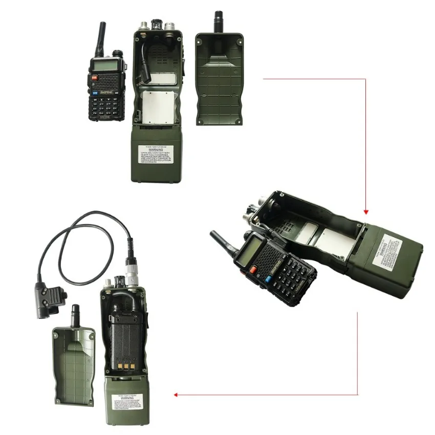 Copia 1:1: la batería y el walkie-talkie se pueden separar, el PRC-152 real es 100% auténtico y hay un enchufe de radio Baofeng que se puede usar directamente conectando el walkie-talkie.También equipamos el Baofeng UV5R/UV82 con una antena personalizada que se puede colocar en el walkie-talkie para un uso normal sin ningún impacto en la señal.Demensión interior: aproximadamente 7*13*3,8 cm, ideal para walkie talkie baofeng UR5R, el tamaño más grande que se puede instalar es baofeng UR82.El U94 ptt está hecho de material ABS de alta calidad, diseño único de 6 pines, diseñado para la caja simulada PRC-152/148. Fácil de instalar, 2 puntos rojos, luego presione y gire para conectarse firmemente a la caja simulada PRC 154.Este clip ptt tiene una buena fuerza de mordida y se puede atrapar fácilmente en cualquier lugar sin caerse.Cumple con la versión estándar militar, el adaptador táctico para auriculares es fácil de usar.