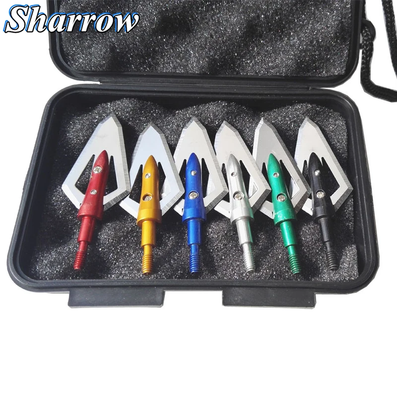 6 piezas de Tiro con Arco fija 2 puntas de flecha afiladas Cuchillas de acero puntas anchas 100 granos con caja para arco compuesto y puntas de flecha de ballesta