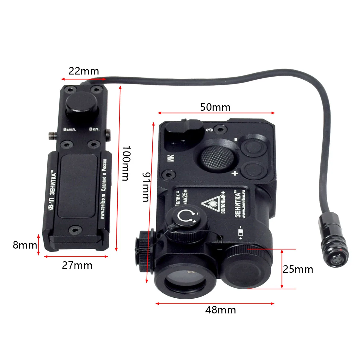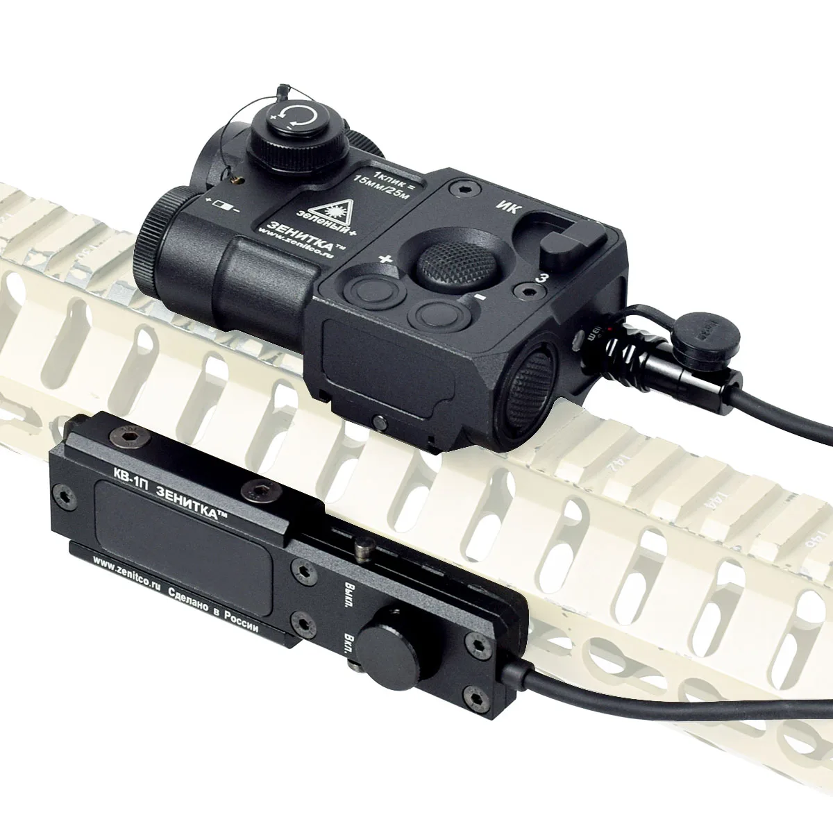 Perst-4 se utiliza para señalar objetivos al observar, inspeccionar y observar armas pequeñas disparando por la noche.Este producto es un pequeño dispositivo mecánico óptico que forma un flujo de radiación láser.Este producto se instala en rieles Picatinny.El interruptor táctico KV-D2 (en el kit) se puede instalar en rieles Picatinny y rieles 1913.Perst-4 contiene 2 funciones láser: