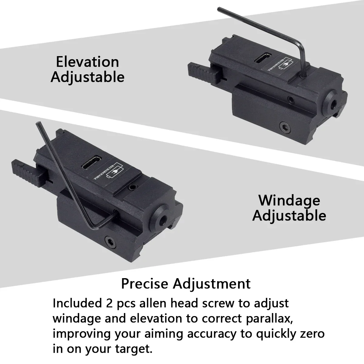 Interruptor de nivel de encendido/apagado en la parte posterior de la miraWindage y elevación ajustables con herramienta hexagonal suministradaFácil de conectar, liviano, instálelo en solo segundos. A prueba de golpesEvite la exposición directa a los ojos.