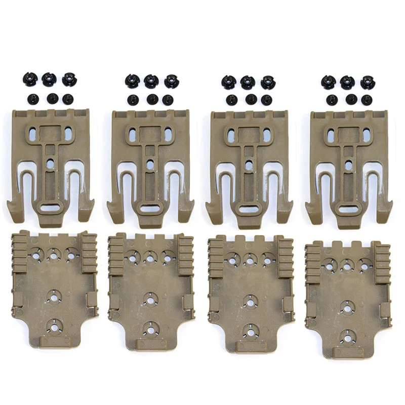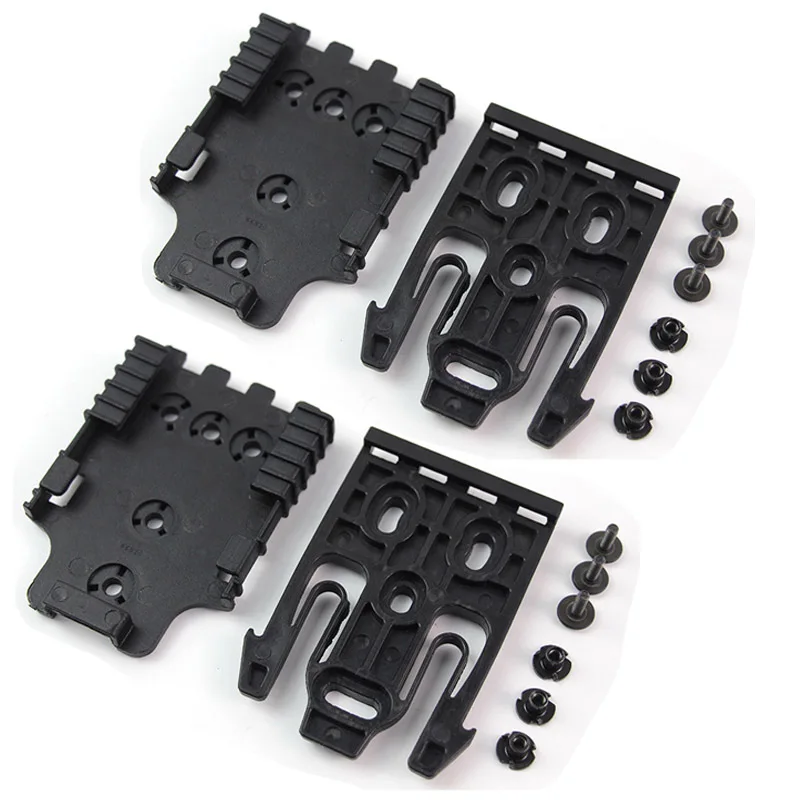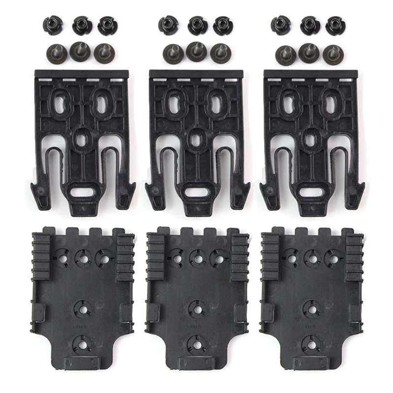 El par macho/hembra QLS, que se muestra aquí, se puede instalar en la combinación de funda de pistola/pieza trasera, lo que le permite cambiar rápidamente su funda a otra pieza trasera que contenga el QLS 22 Según sea necesario. Las dos partes, la QLS 19 y la QLS 22 se deslizan rápida y fácilmente juntas y se bloquean, formando un accesorio sólido como una roca entre su funda y UBL, placa de pierna táctica, chaleco MOLLE, tablero de coche, mesita de noche, o en cualquier otro lugar donde Monte la placa receptora.