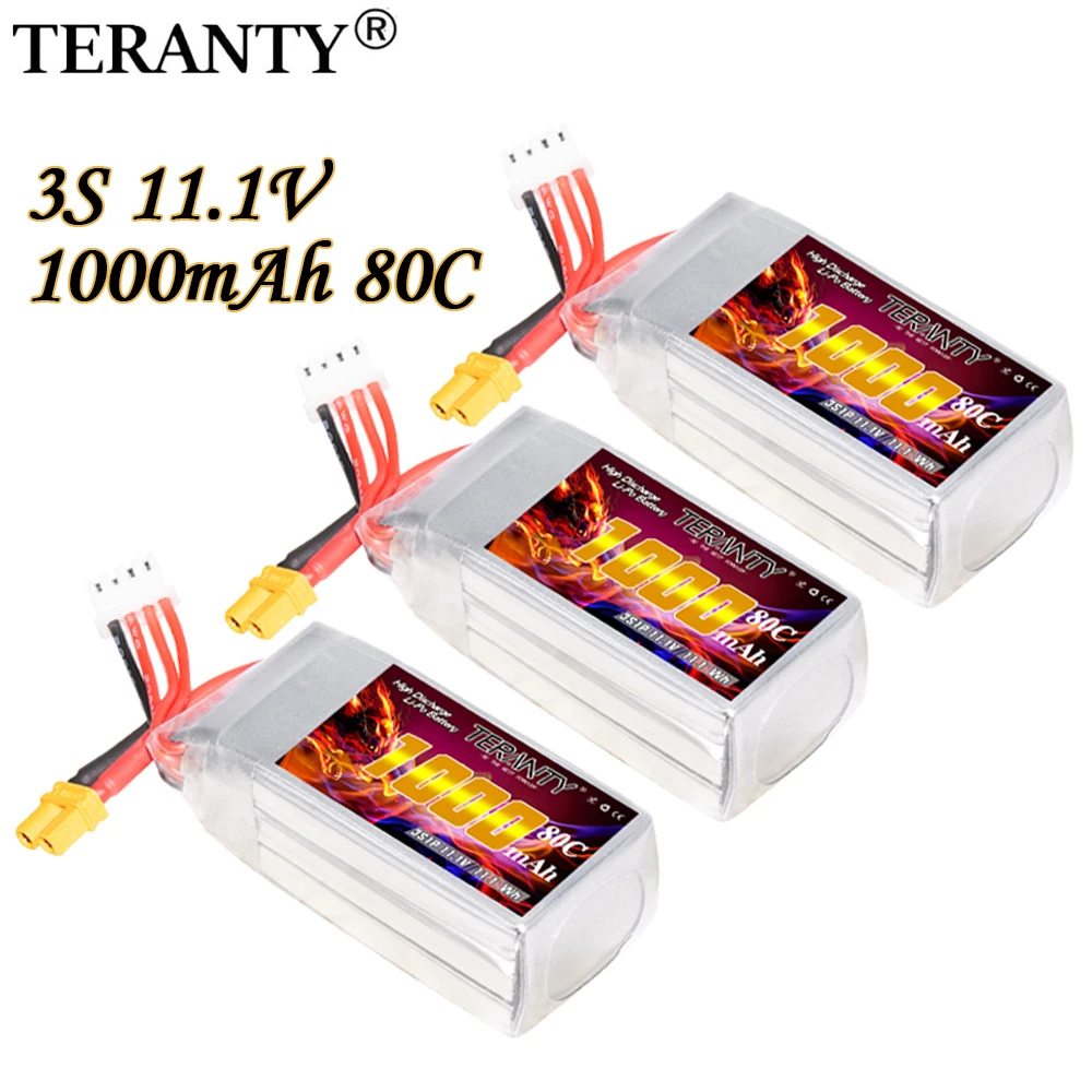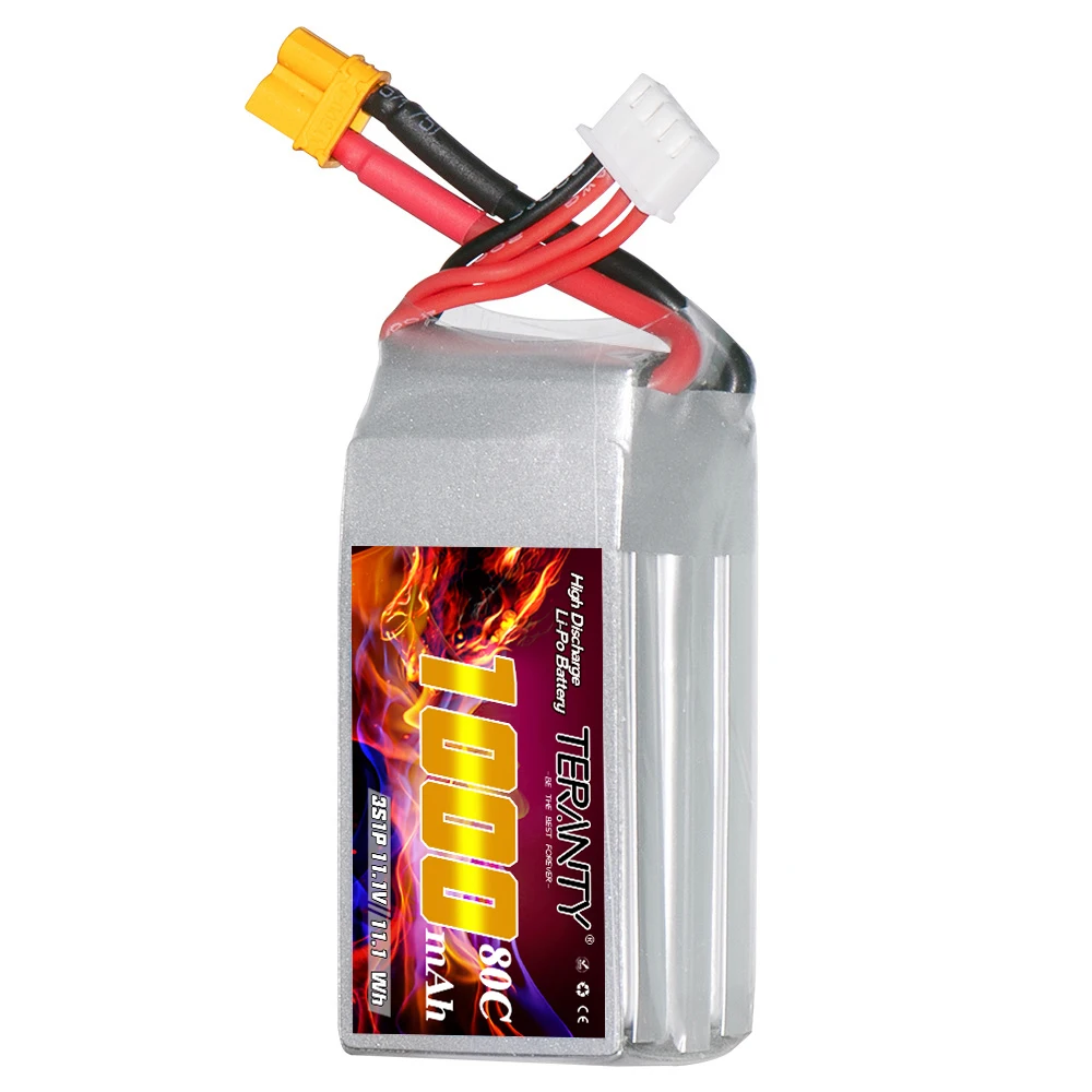 Specification:Brand: TERANTYVoltage: 11.1VCapacity: 1000mAhDischarge Rate: 80C Continual / 160C BurstConfiguration: 3S1PConnector Type: XT30PlugBalancer Connector Type: JST-XHLength: 63mmWidth: 30mmHeight: 24mmBattery Weight: 80g