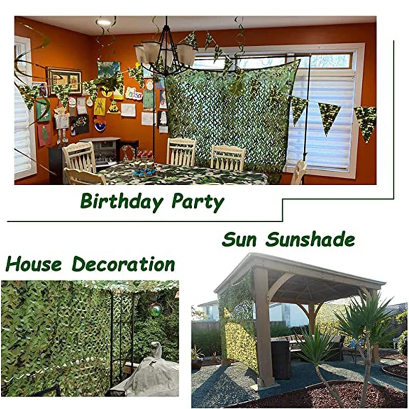 -Red de camuflaje militar: hay una eslinga por metro, que se puede colgar fácilmente. Cosemos y reforzamos los bordes de la red de camuflaje para que dure más y sea más cómodo de usar.